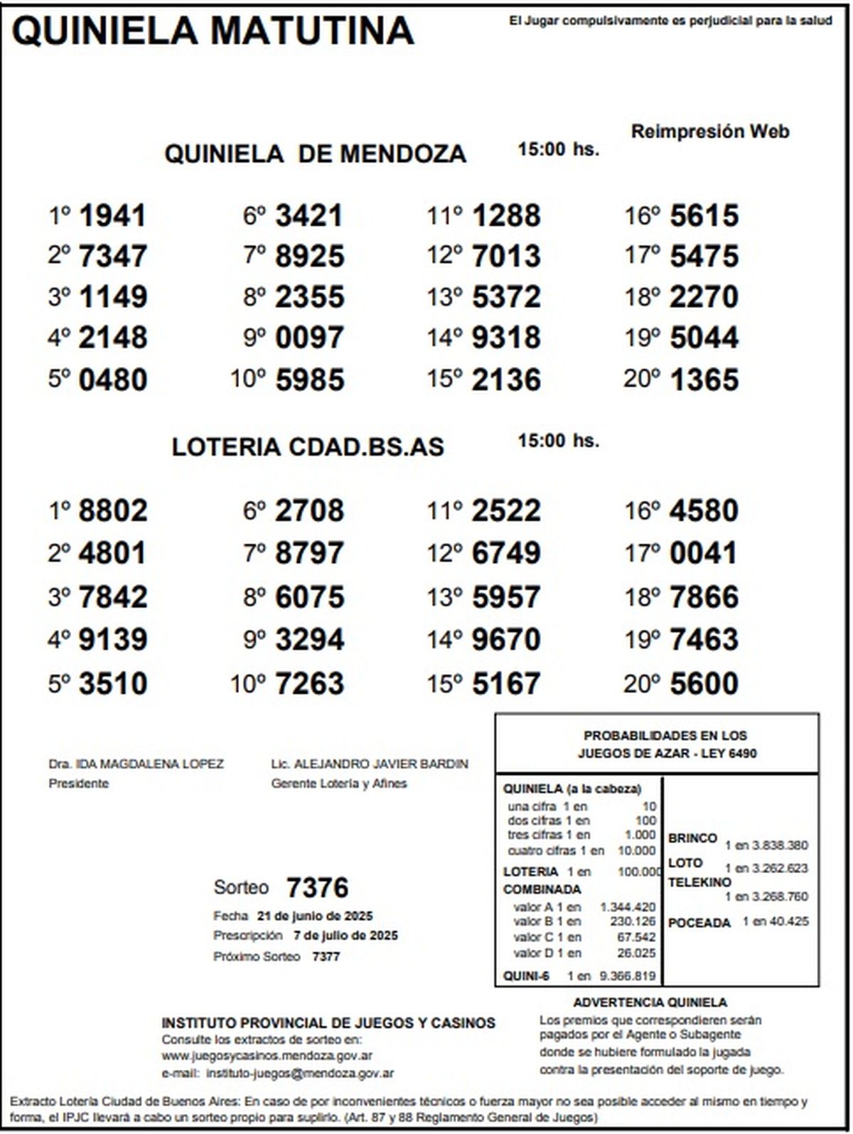 Resultados Quiniela de Mendoza: La Matutina del 21 de junio de 2025