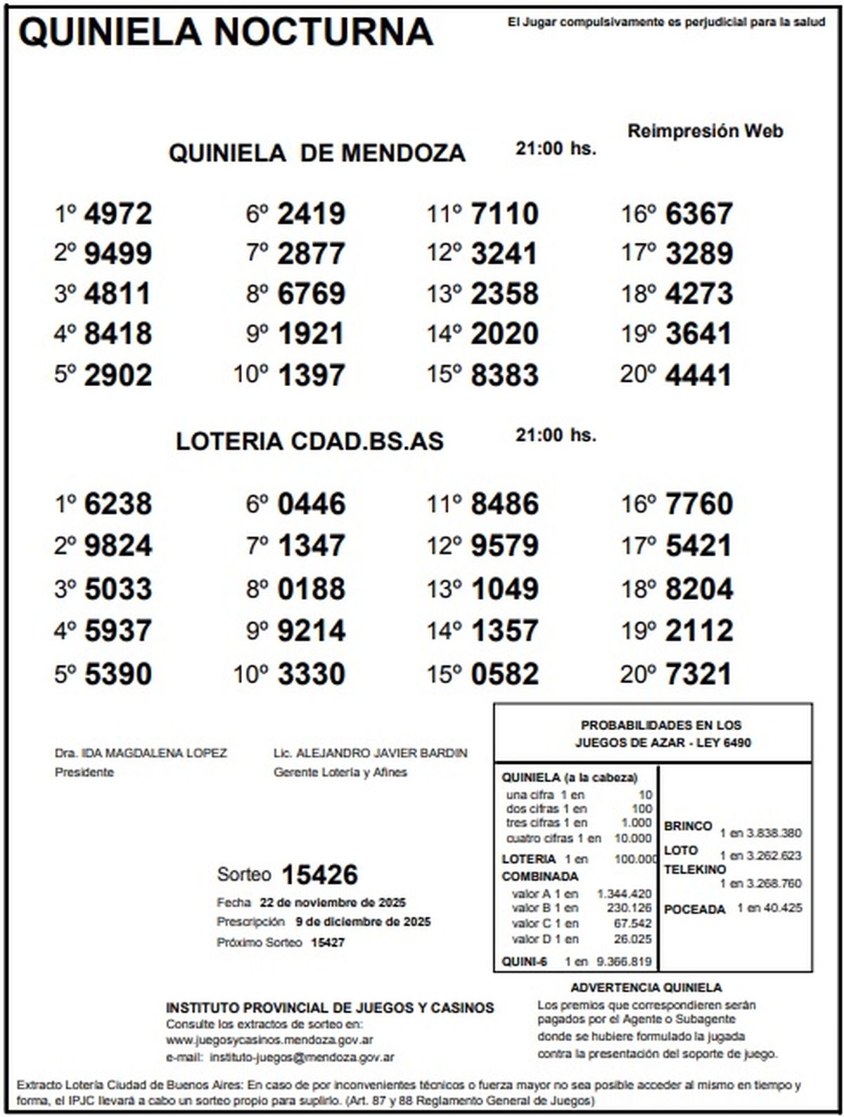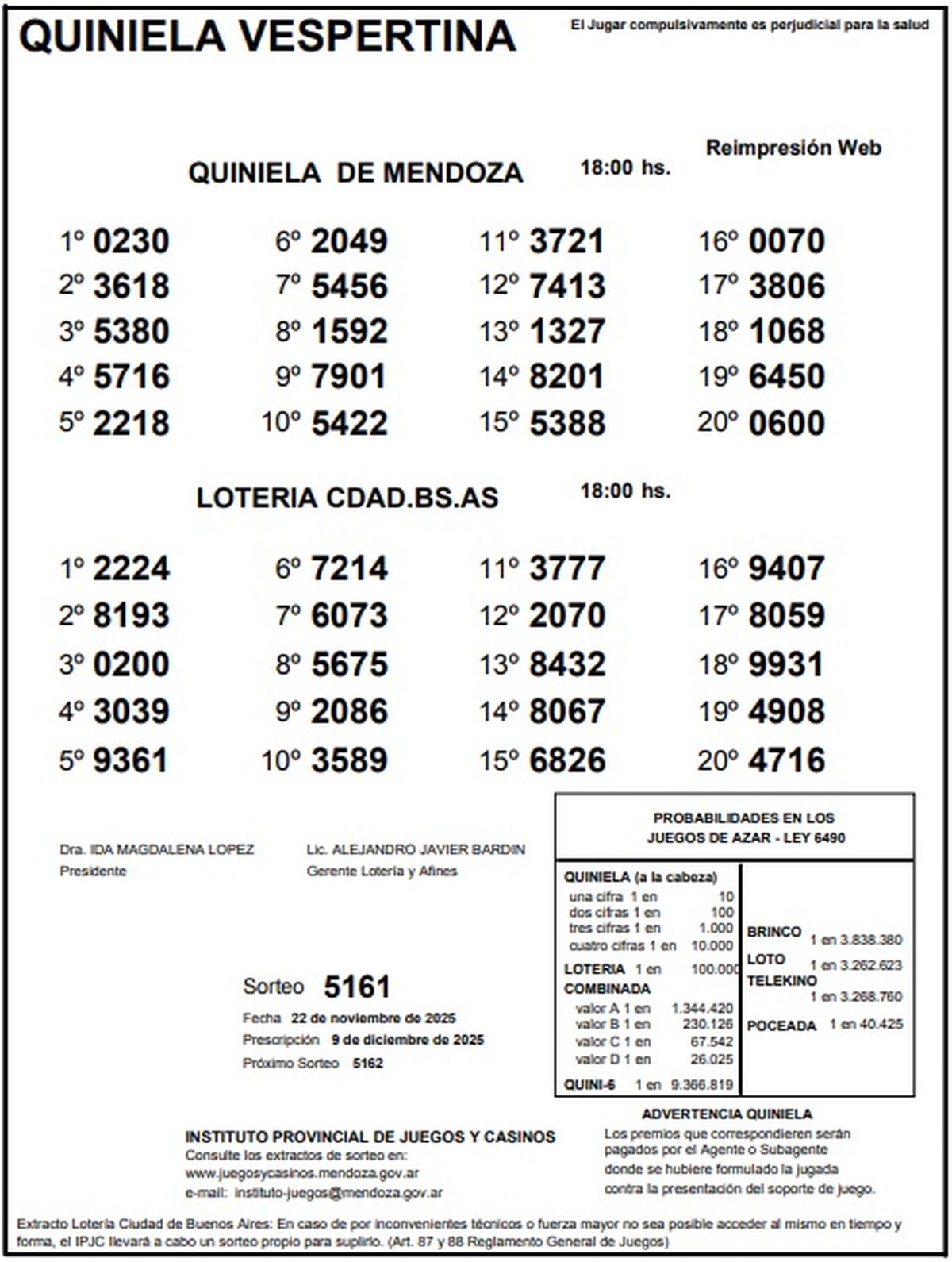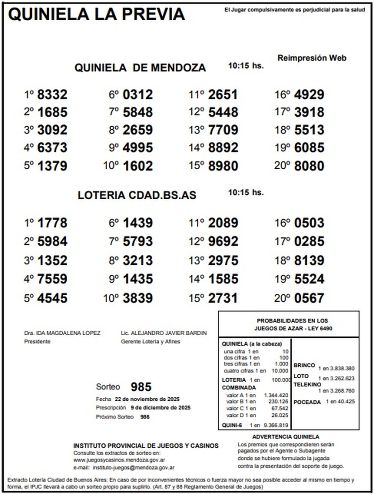 Resultados Quiniela de Mendoza: La Previa del 22 de noviembre de 2025