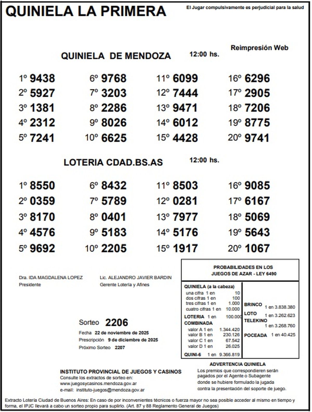 Resultados Quiniela de Mendoza: La Primera del 22 de noviembre de 2025