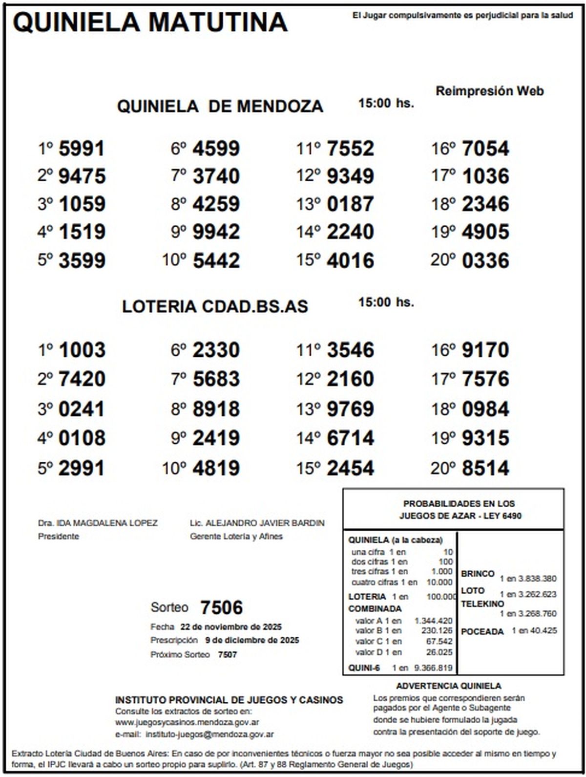 Resultados Quiniela de Mendoza: La Matutina del 22 de noviembre de 2025