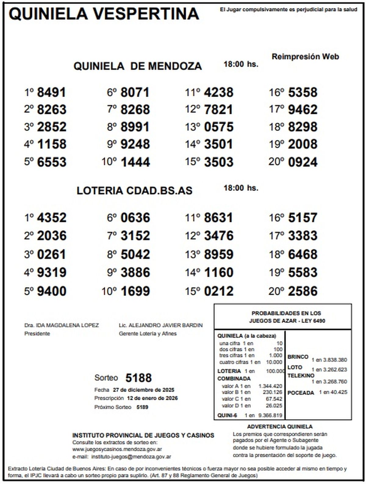 Resultados Quiniela de Mendoza: La Vespertina del 27 de diciembre de 2025