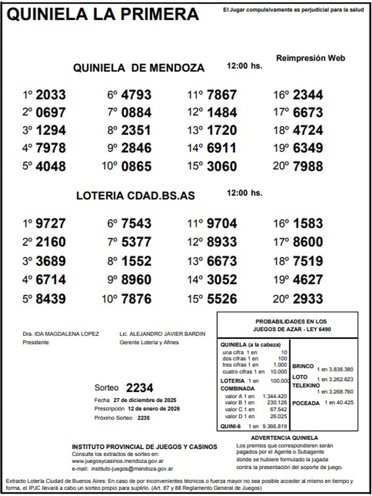 Resultados Quiniela de Mendoza: La Primera del 27 de diciembre de 2025