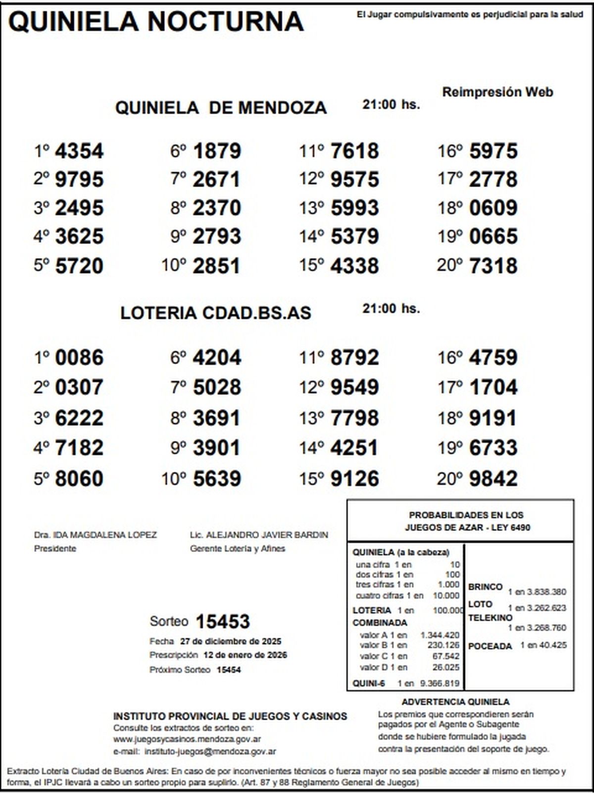 Quiniela de Mendoza: resultados de la Nocturna de este sábado, 27 de diciembre de 2025