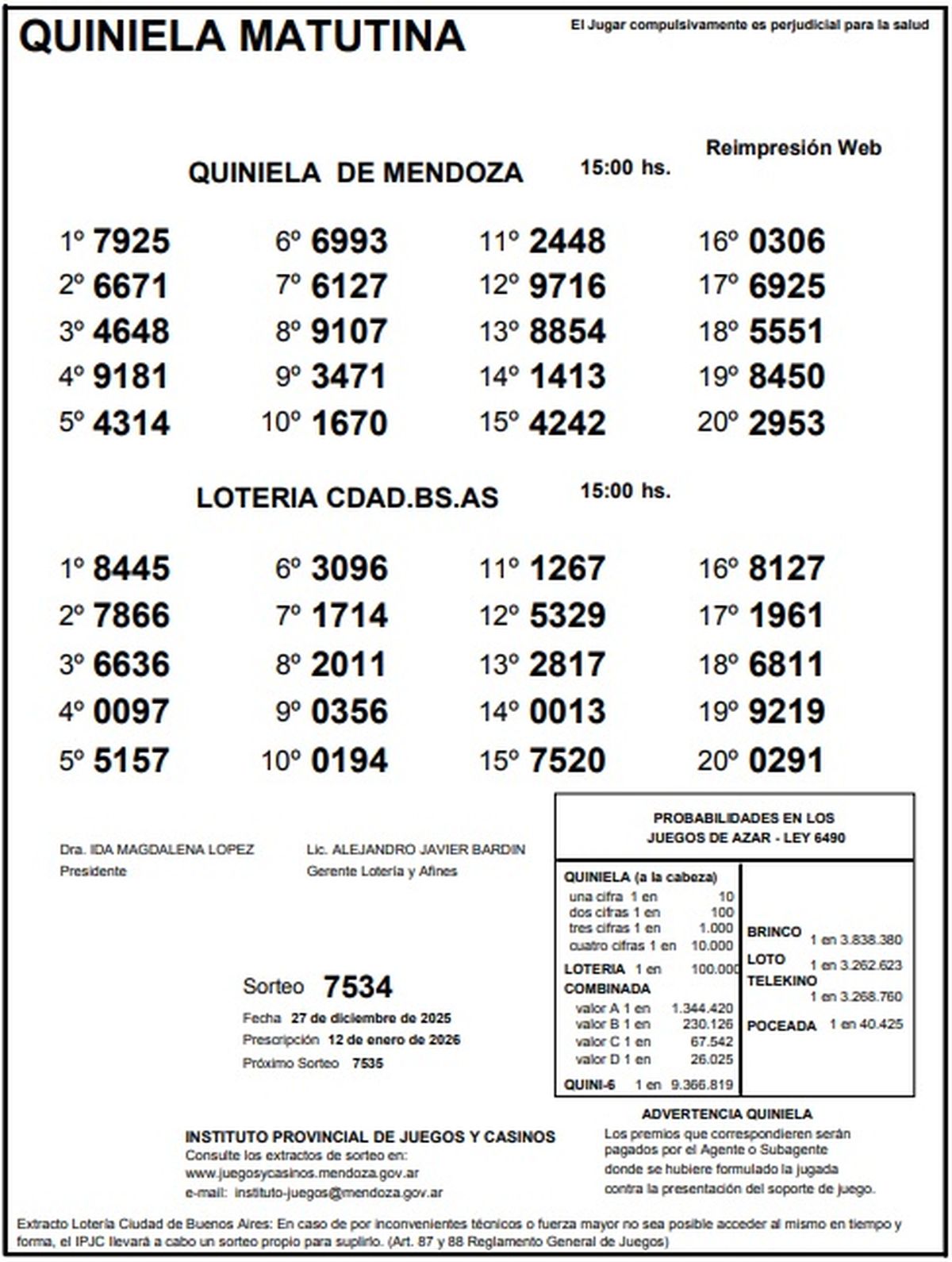 Resultados Quiniela de Mendoza: La Matutina del 27 de diciembre de 2025