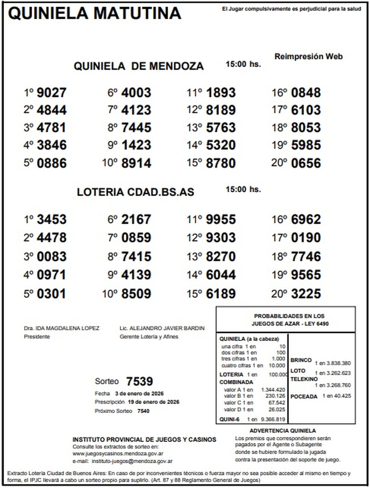 Resultados Quiniela de Mendoza: La Matutina del 3 de enero de 2026
