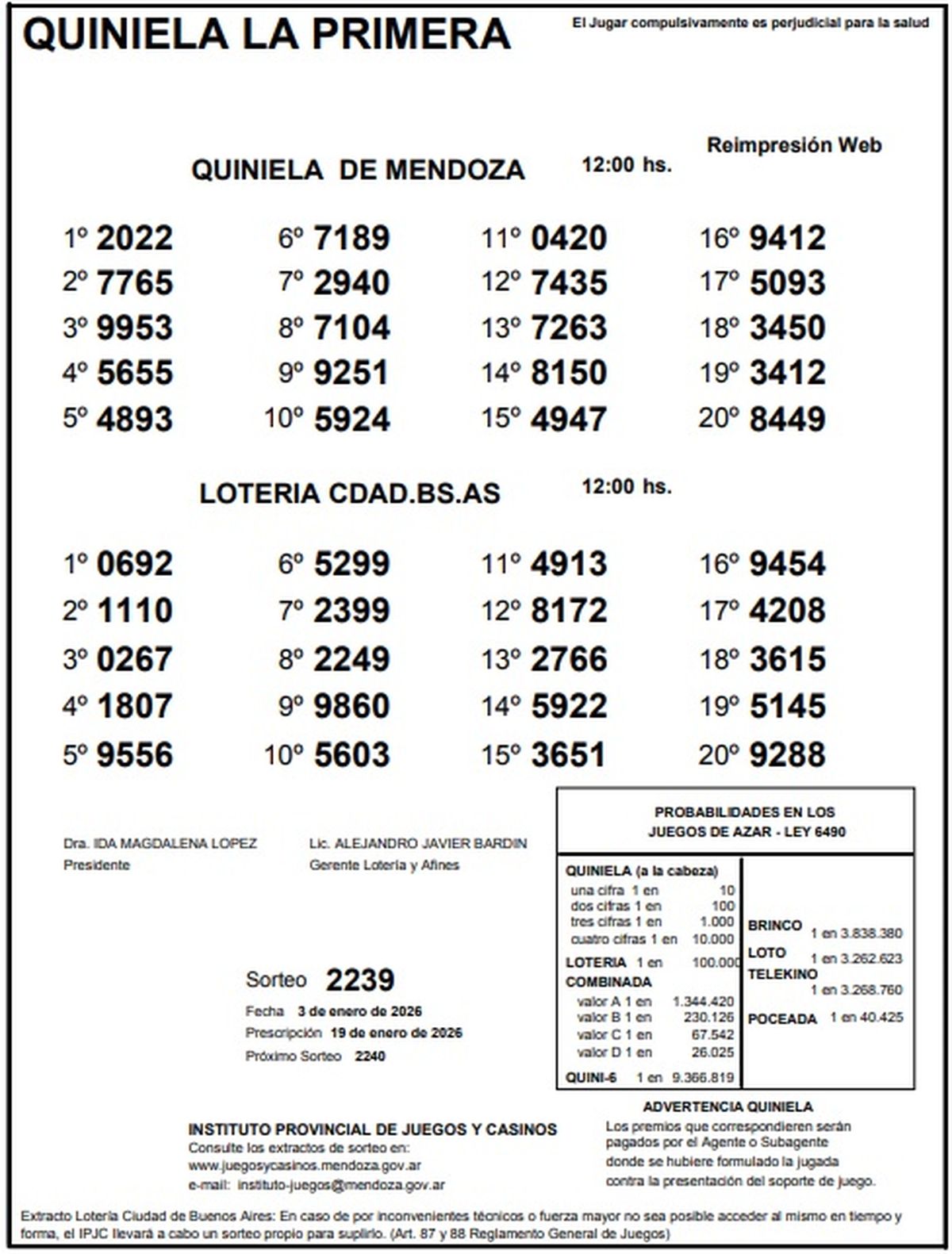 Resultados Quiniela de Mendoza: La Primera del 3 de enero de 2026