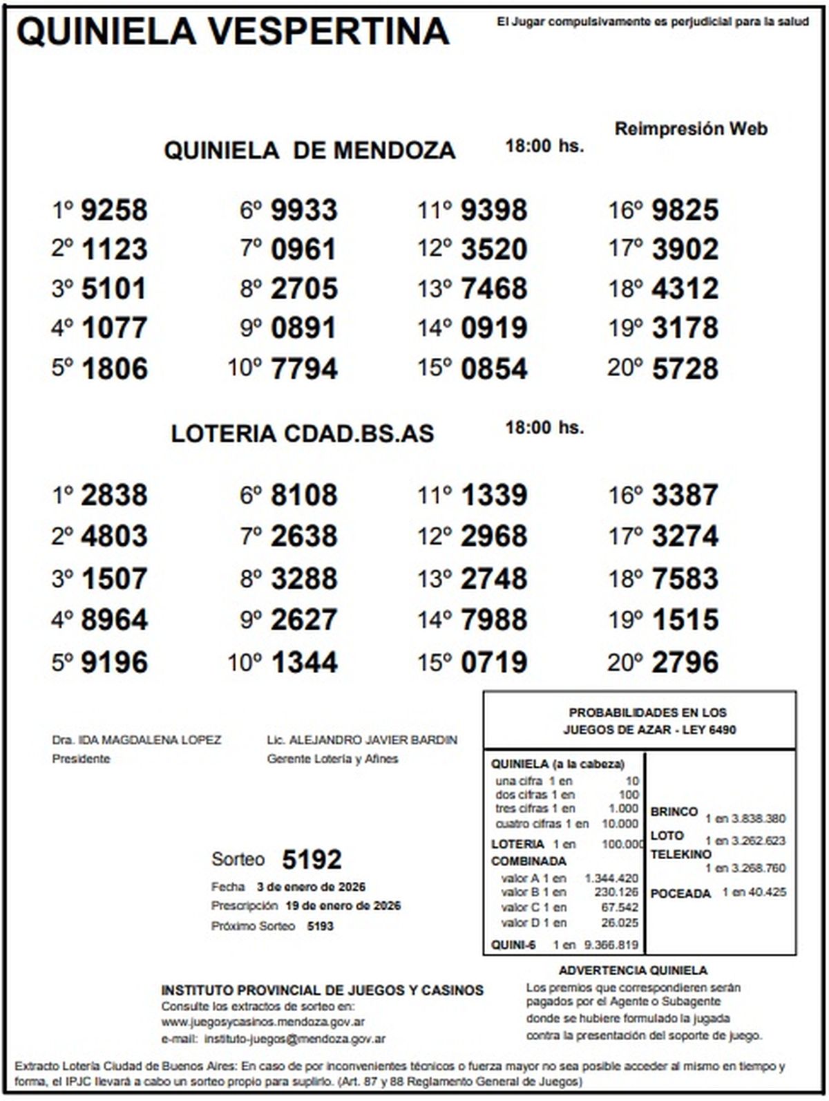 Resultados Quiniela de Mendoza: La Vespertina del 3 de enero de 2026