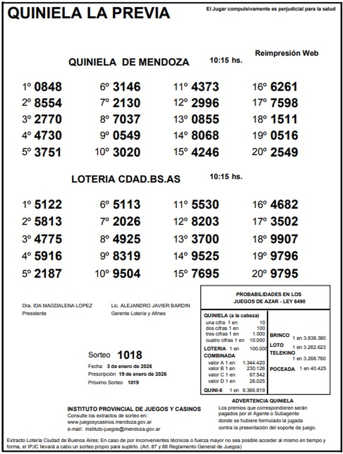 Resultados Quiniela de Mendoza: La Previa del 3 de enero de 2026
