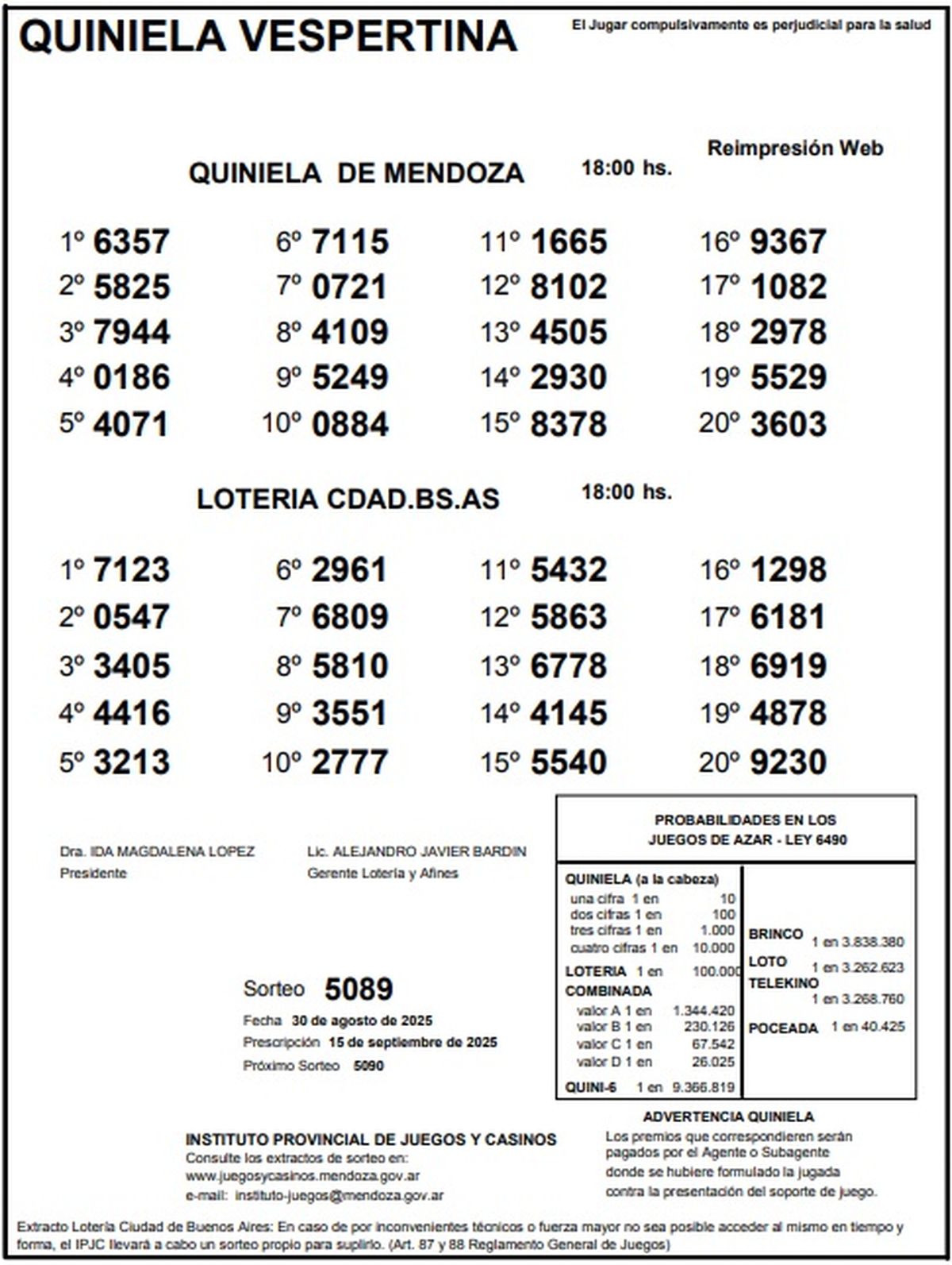 Resultados Quiniela de Mendoza: La Vespertina del 30 de agosto de 2025