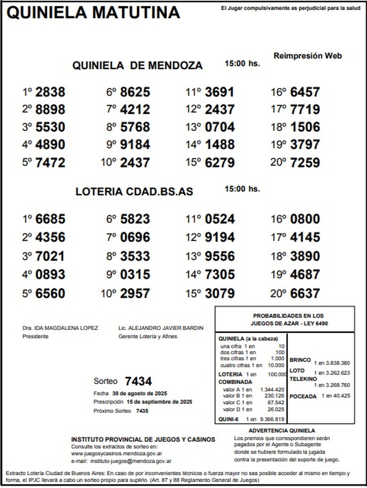 Resultados Quiniela de Mendoza: La Matutina del 30 de agosto de 2025