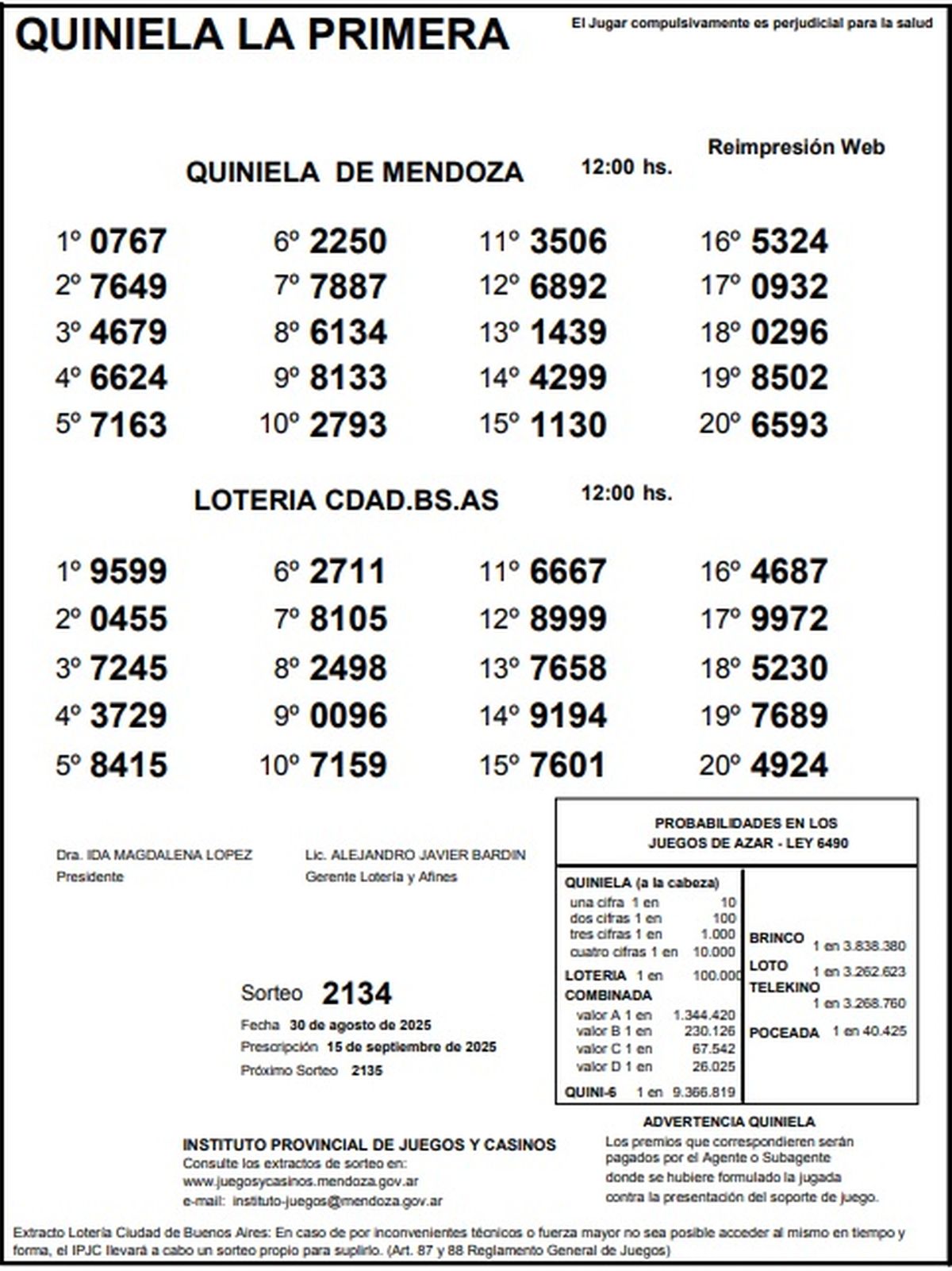Resultados Quiniela de Mendoza: La Primera del 30 de agosto de 2025
