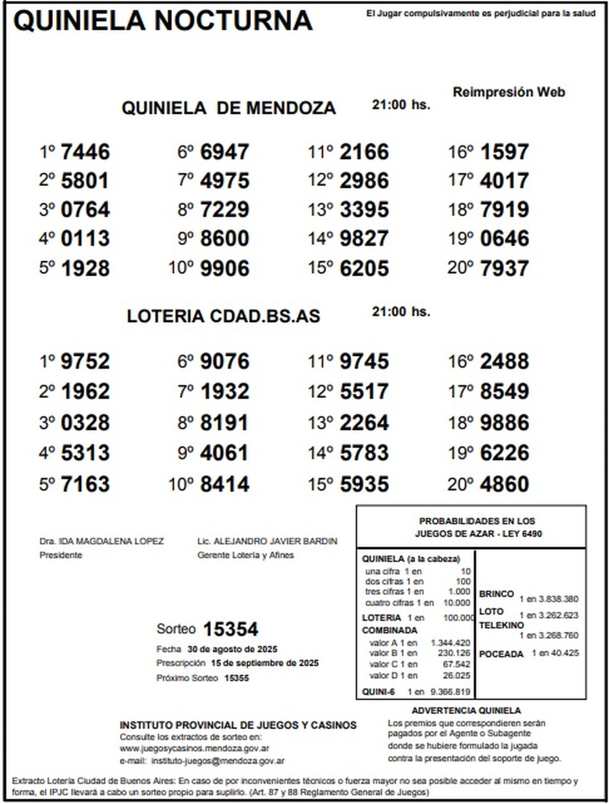 Quiniela de Mendoza: resultados de la Nocturna de este sábado, 30 de agosto de 2025