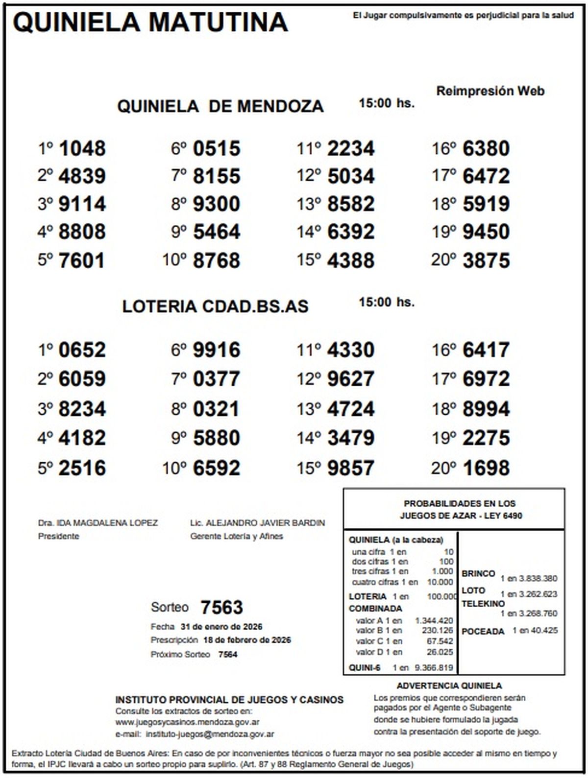 Resultados Quiniela de Mendoza: La Matutina del 31 de enero de 2026