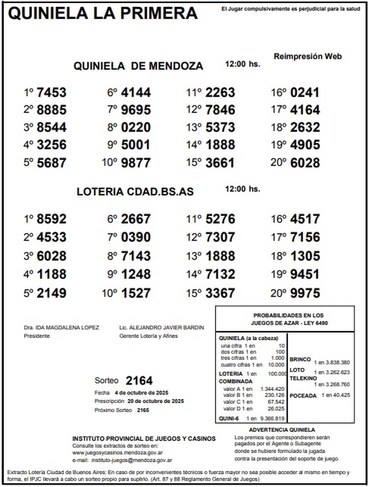 Resultados Quiniela de Mendoza: La Primera del 4 de octubre de 2025