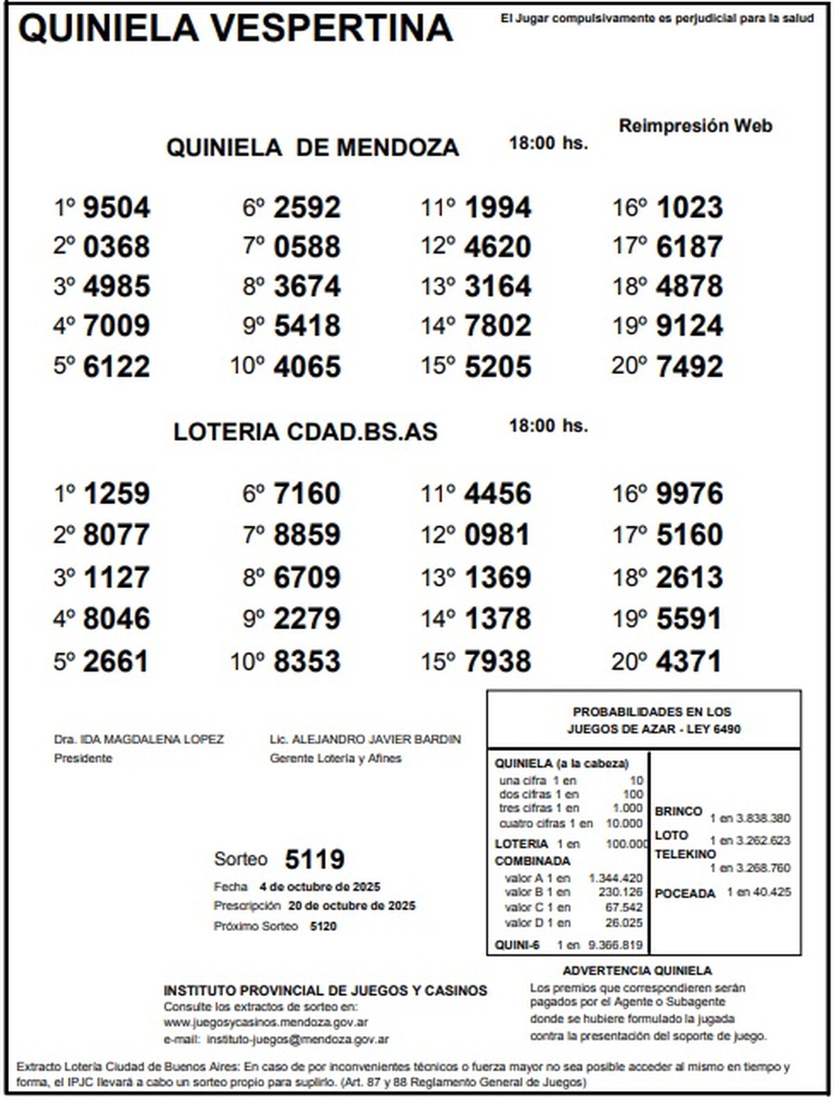 Resultados Quiniela de Mendoza: La Vespertina del 4 de octubre de 2025