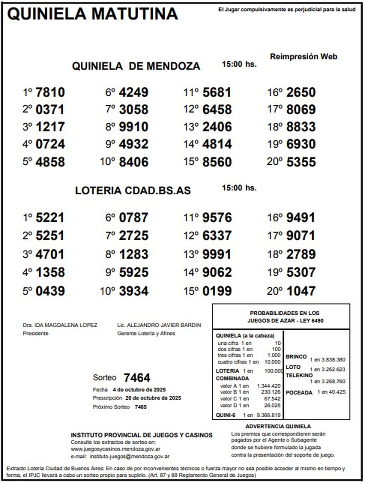 Resultados Quiniela de Mendoza: La Matutina del 4 de octubre de 2025