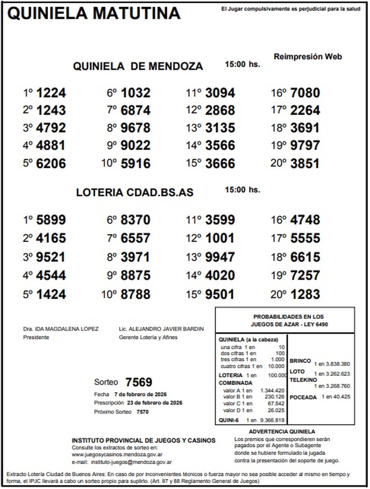Resultados Quiniela de Mendoza: La Matutina del 7 de febrero de 2026
