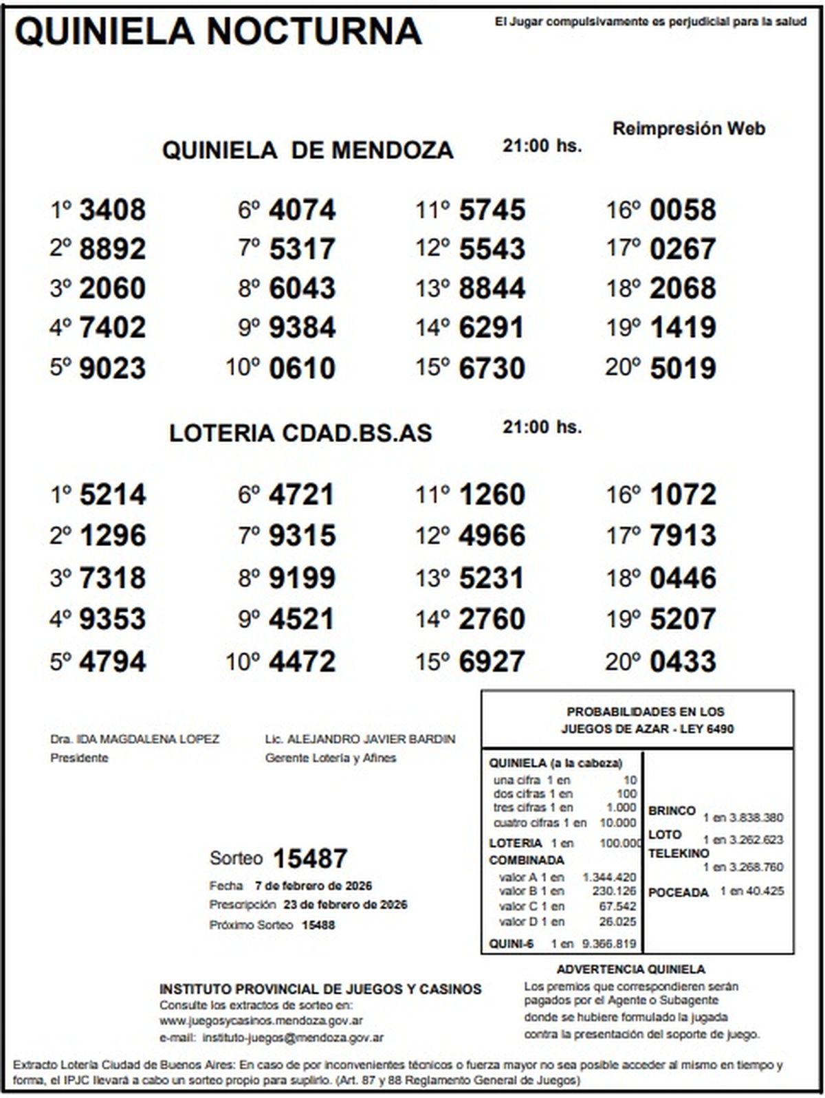 Quiniela de Mendoza: resultados de la Nocturna de este sábado, 7 de febrero de 2026