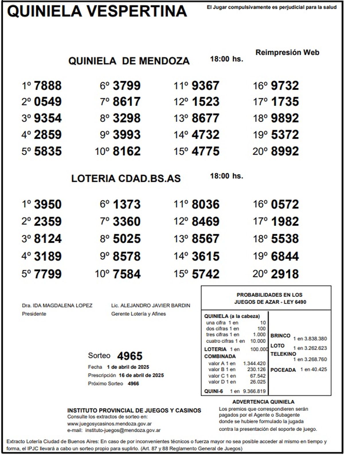 Resultados Quiniela de Mendoza: La Vespertina del 1 de abril de 2025