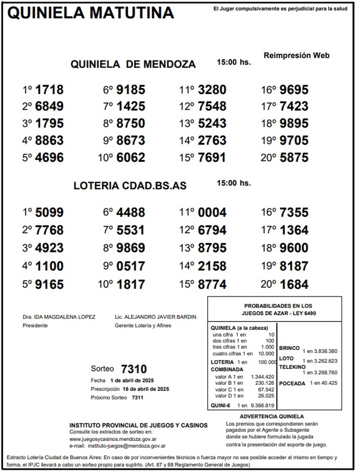 Resultados Quiniela de Mendoza: La Matutina del 1 de abril de 2025