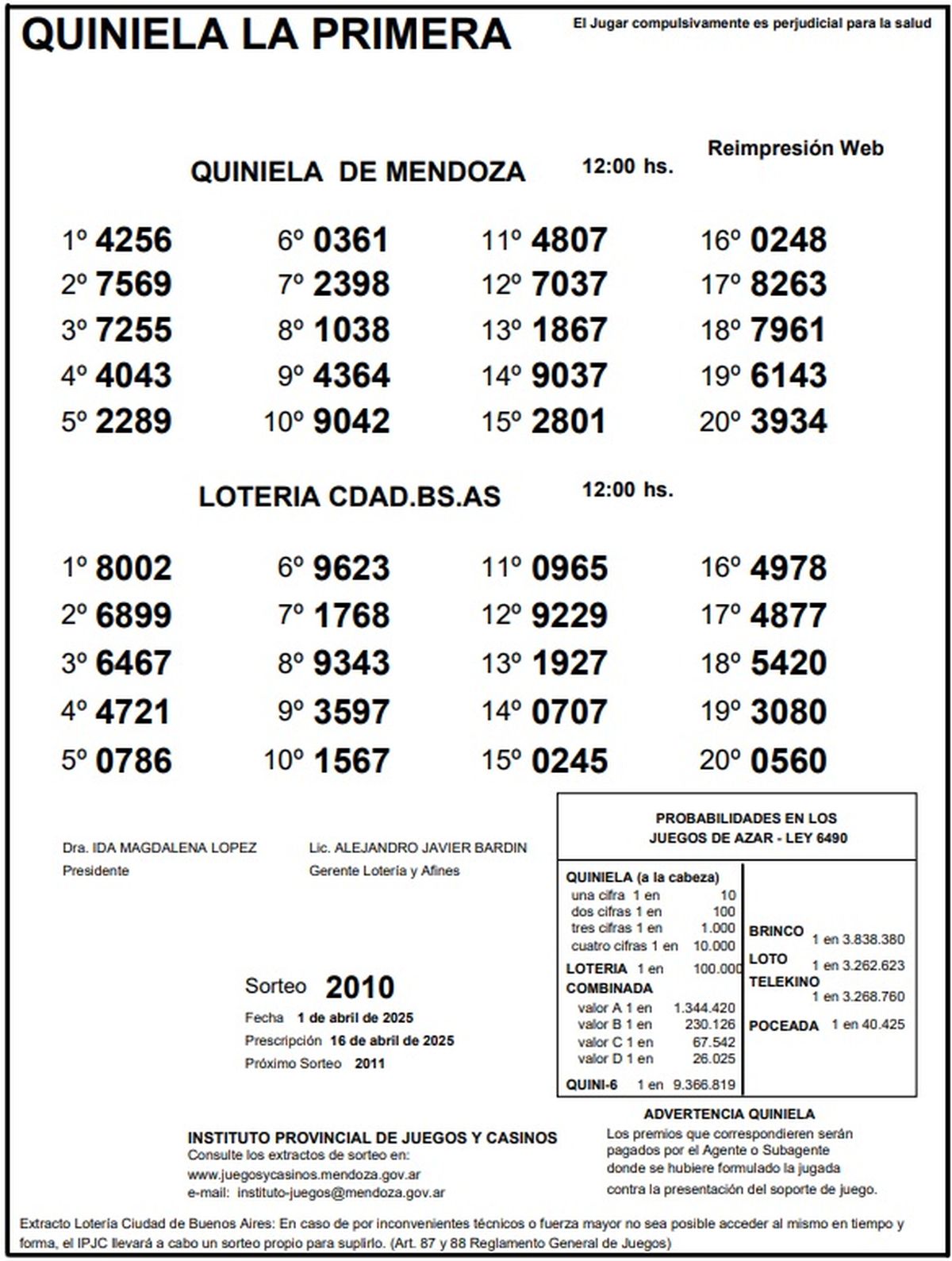 Resultados Quiniela de Mendoza: La Primera del 1 de abril de 2025