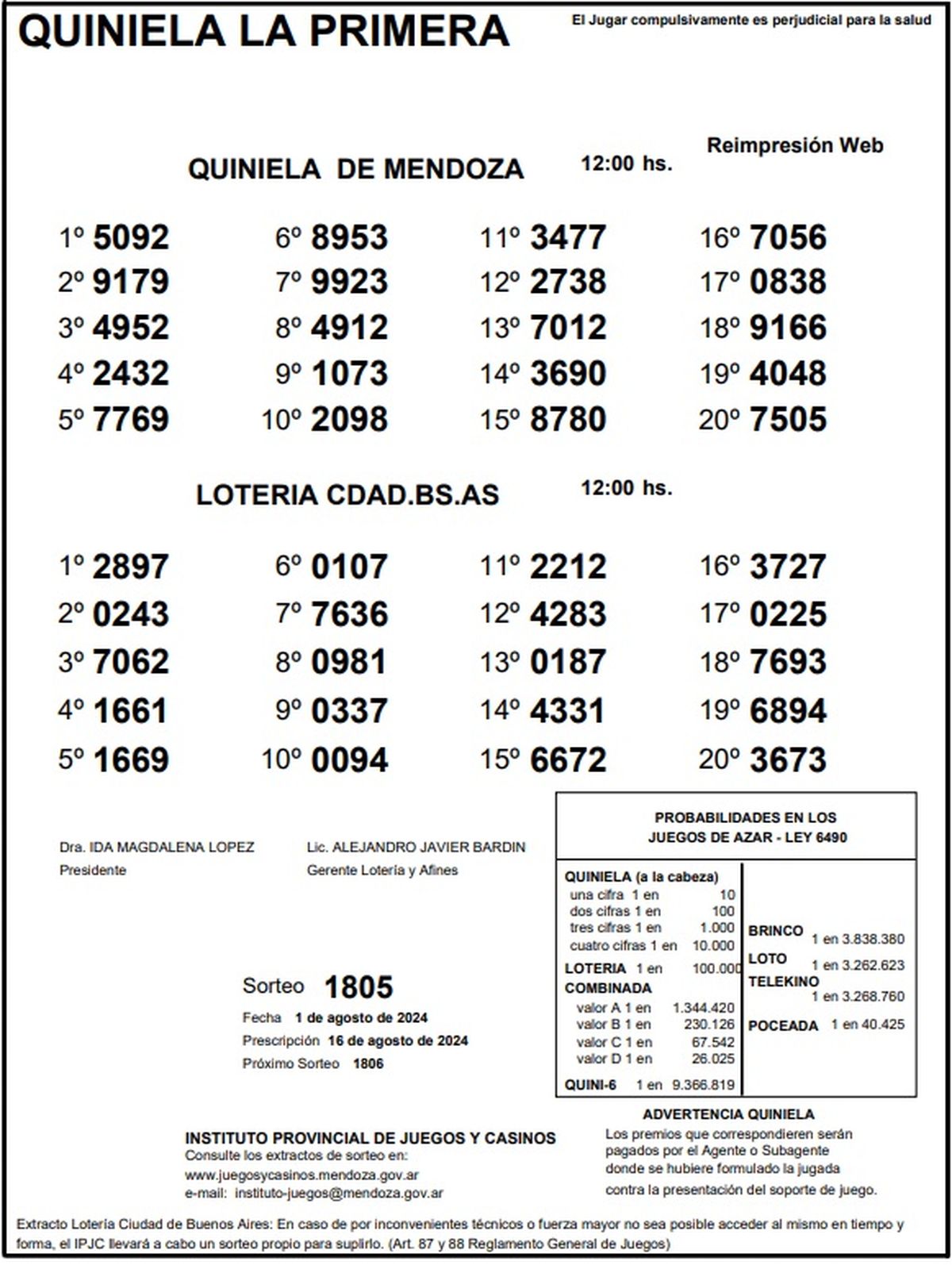 Resultados Quiniela de Mendoza: La Primera del 1 de agosto 2024