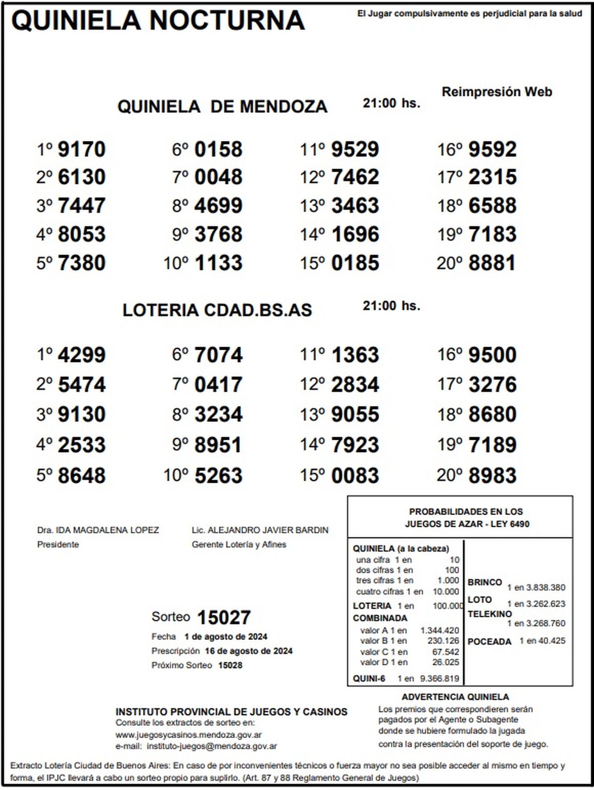 Quiniela de Mendoza: resultados de la Nocturna de hoy, 1 de agosto de 2024