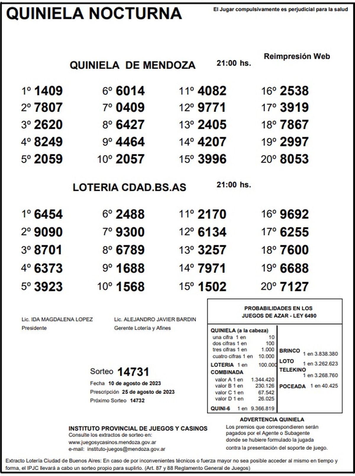 Quiniela de Mendoza: resultados de la Nocturna de hoy, 10 de agosto de 2023