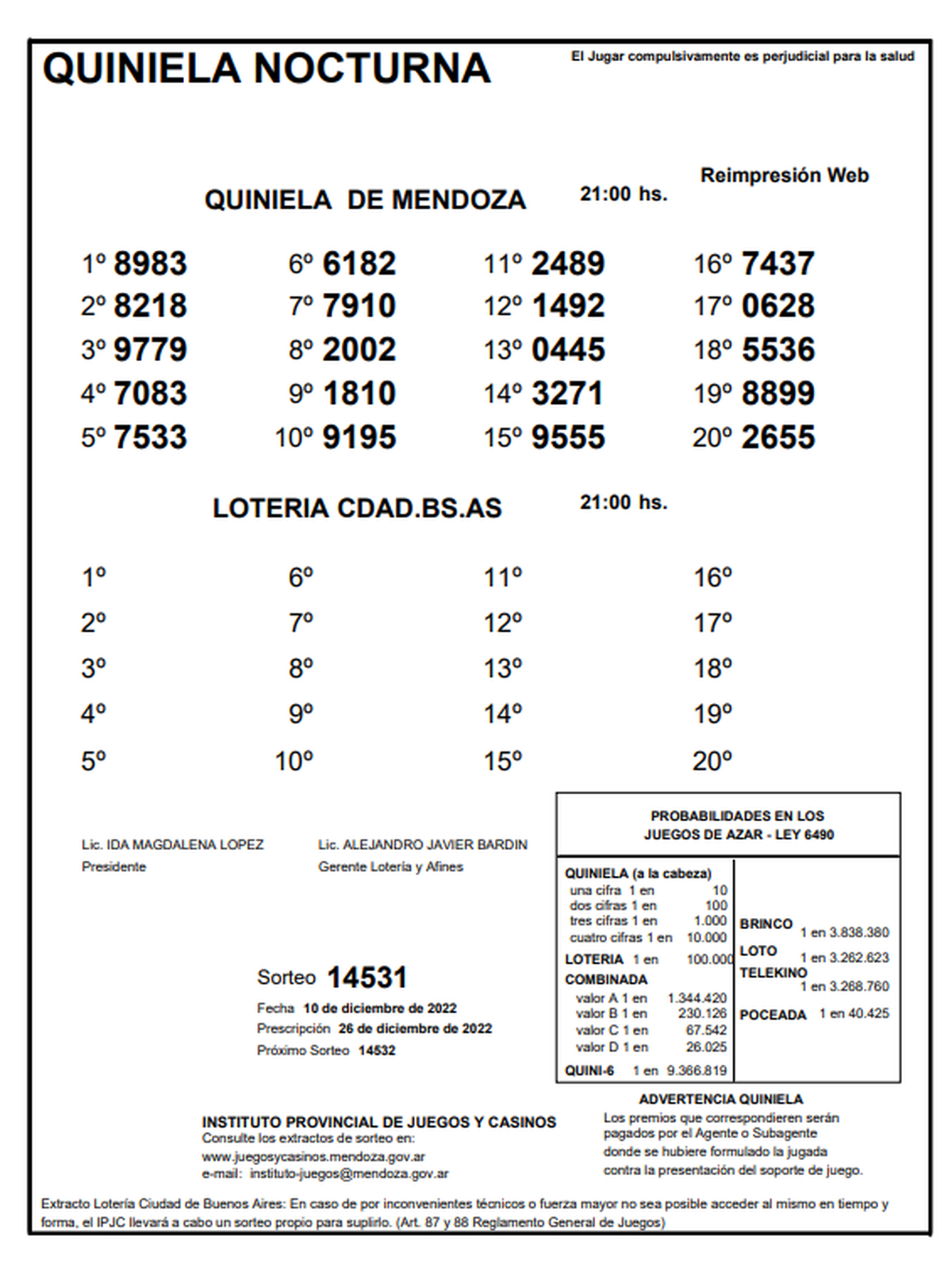 VespertinaEste sábado 10 de diciembre se realizó el sorteo número 14531 de la Quiniela de Mendoza en su edición La Nocturna y el número ganador resultó ser el 8983. Mientras que en el segundo lugar salió el 8218 y en el tercer lugar el 9779.