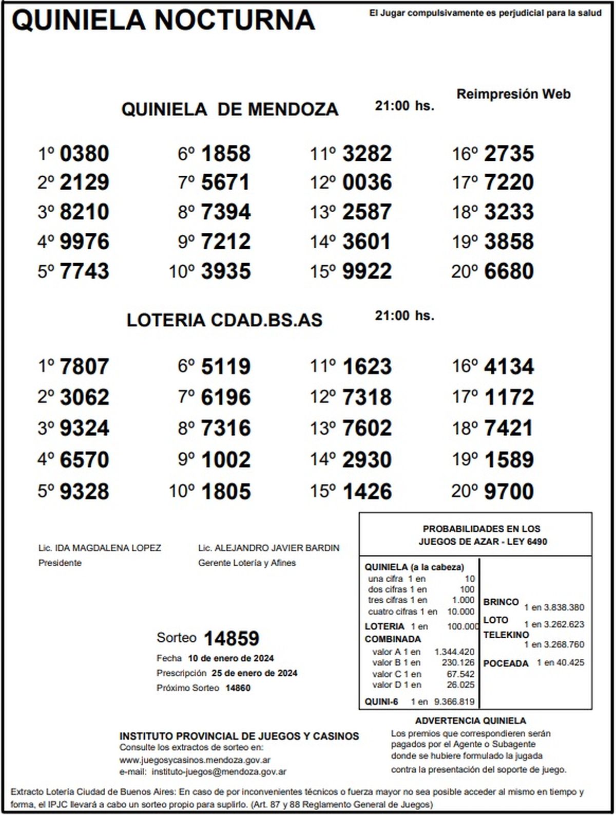 Quiniela de Mendoza: resultados de la Nocturna de hoy, 10 de enero de 2024