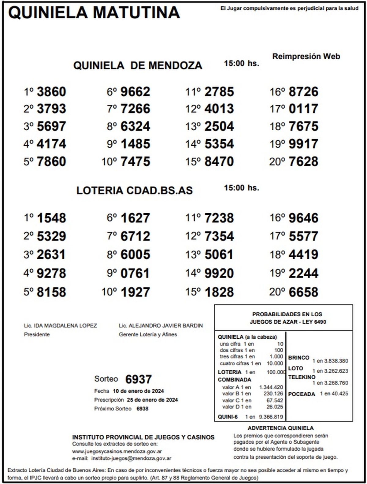 Resultados Quiniela de Mendoza: La Matutina del 10 de enero 2024