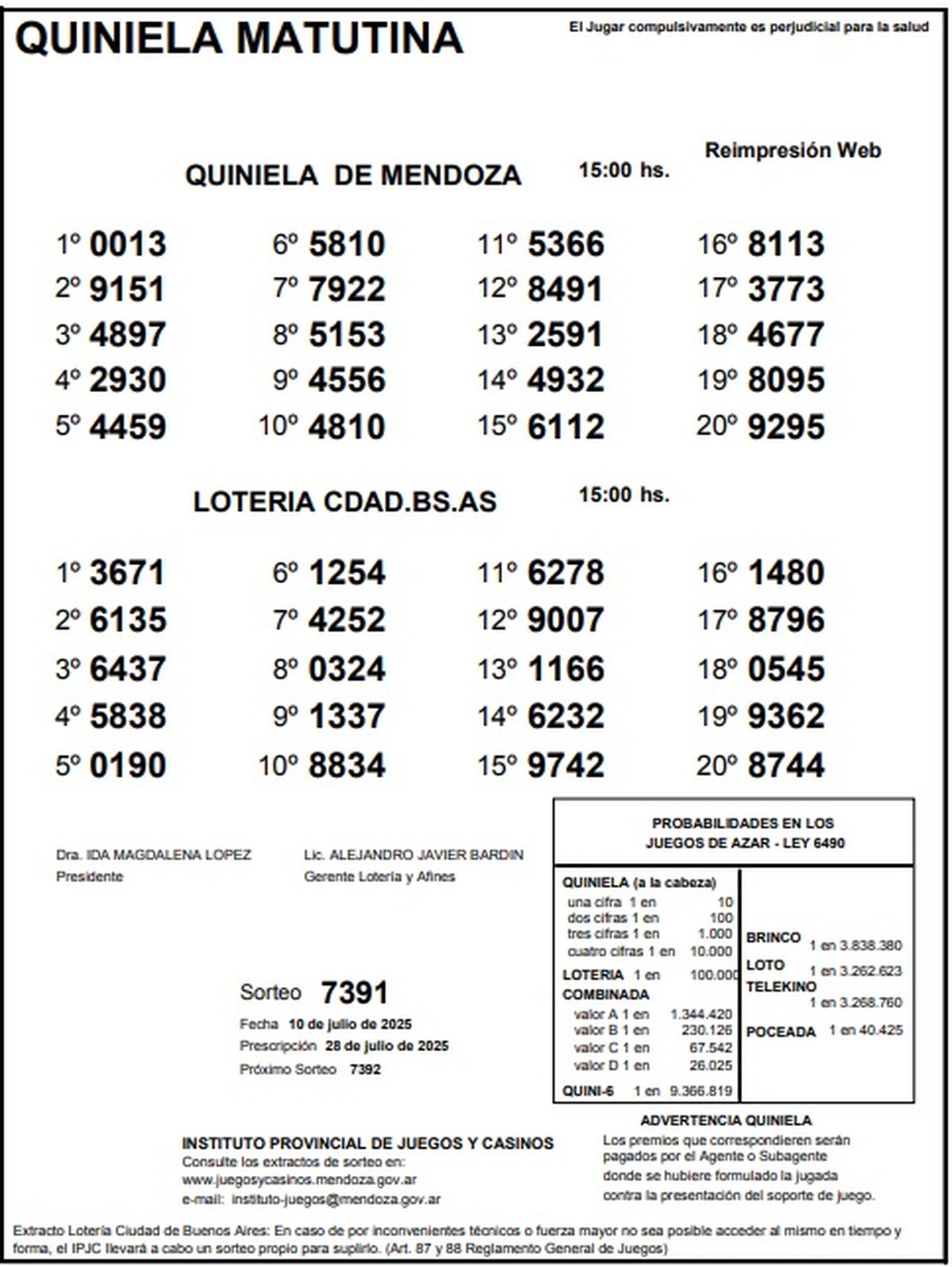 Resultados Quiniela de Mendoza: La Matutina del 10 de julio de 2025