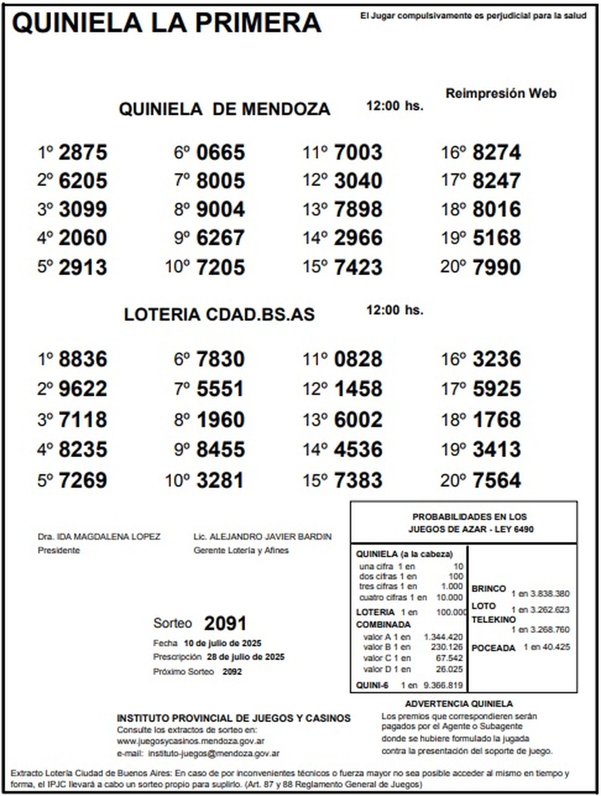 Resultados Quiniela de Mendoza: La Primera del 10 de julio de 2025
