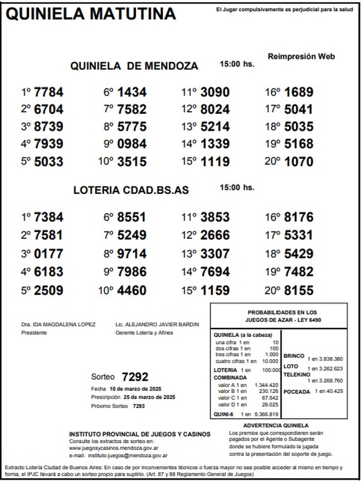 Resultados Quiniela de Mendoza: La Matutina del 10 de marzo de 2025