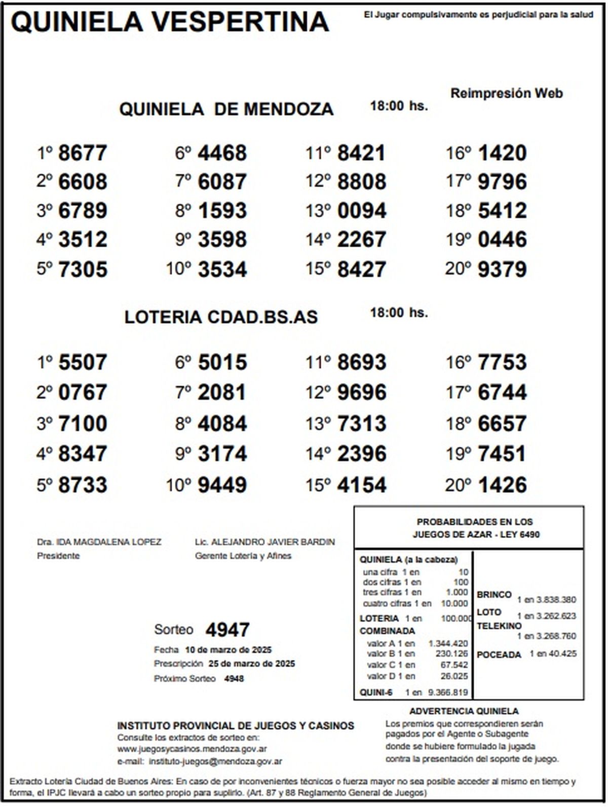 Resultados Quiniela de Mendoza: La Vespertina del 10 de marzo de 2025
