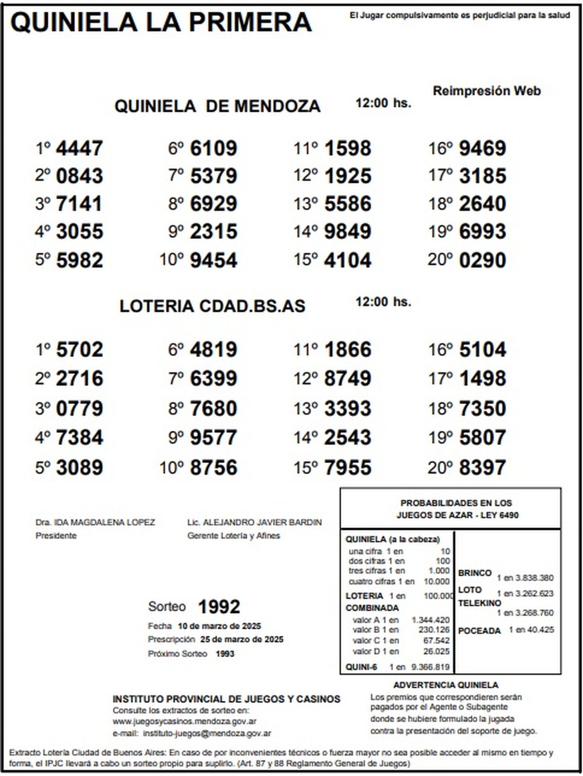 Resultados Quiniela de Mendoza: La Primera del 10 de marzo de 2025