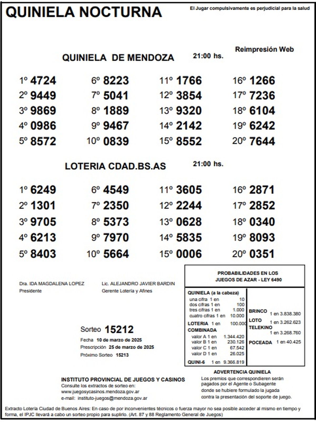 Quiniela de Mendoza: resultados de la Nocturna de hoy, 10 de marzo de 2025
