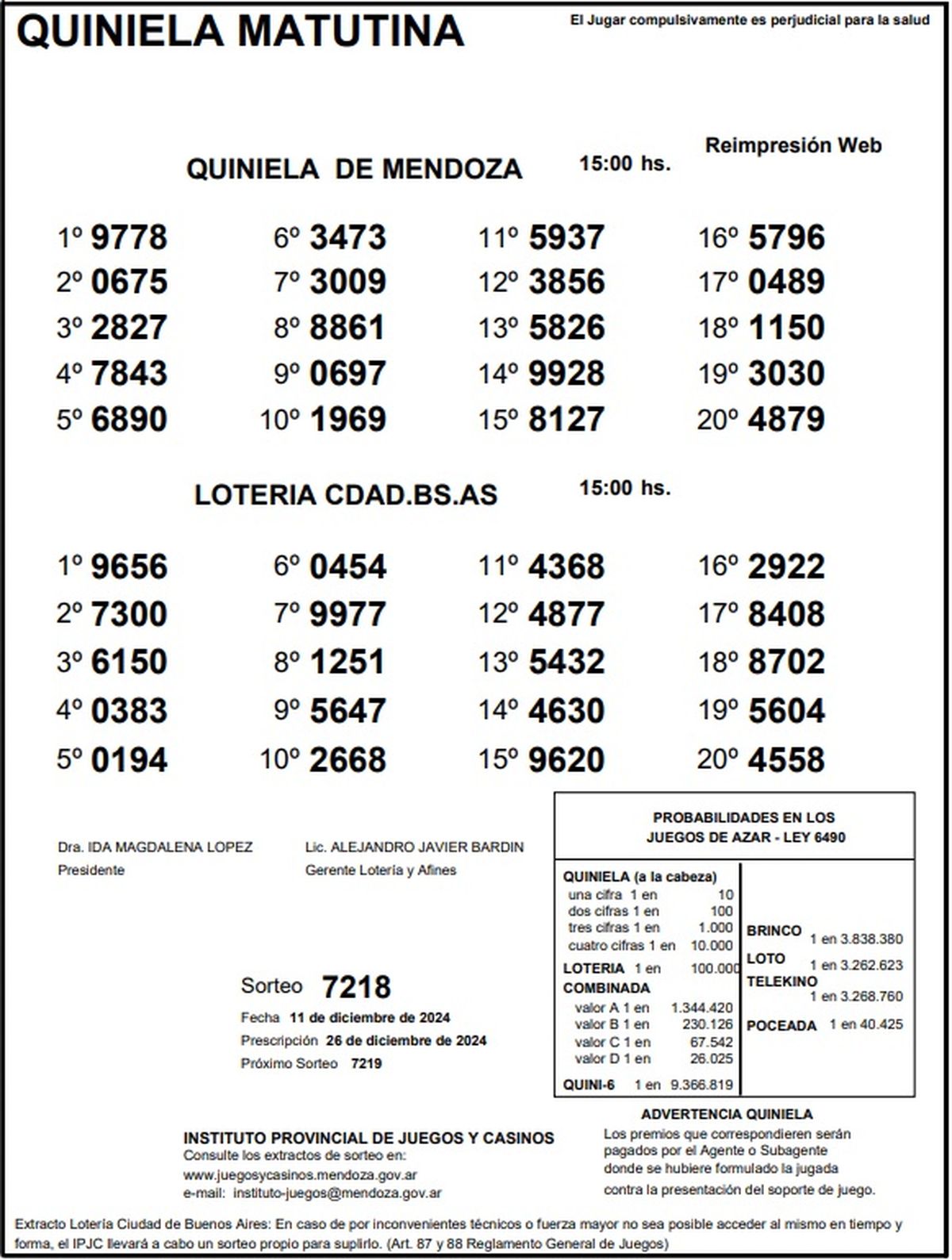 Resultados Quiniela de Mendoza: La Matutina del 11 de diciembre de 2024