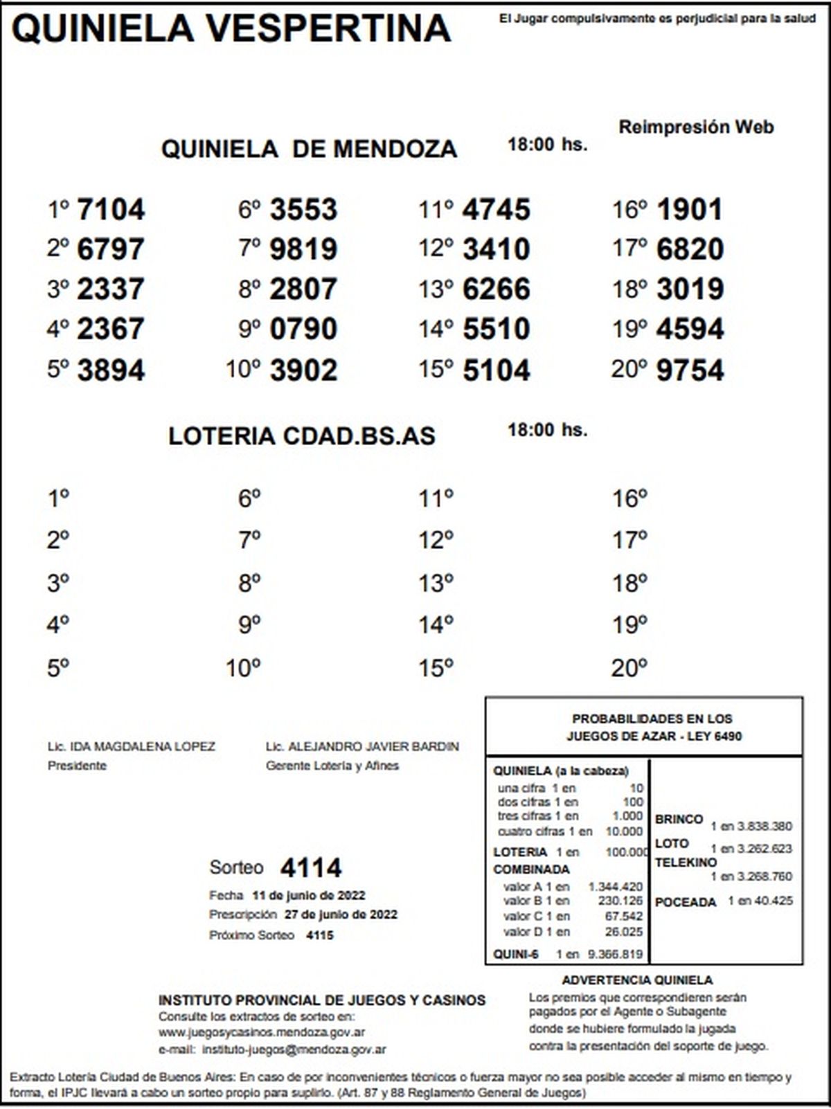 Este sábado 11 de junio se realizó el sorteo número 4114 de la Quiniela de Mendoza en su edición Vespertina y el número ganador resultó ser el 7104. Mientras que en el segundo lugar salió el 6797 y en el tercer lugar el 2337.