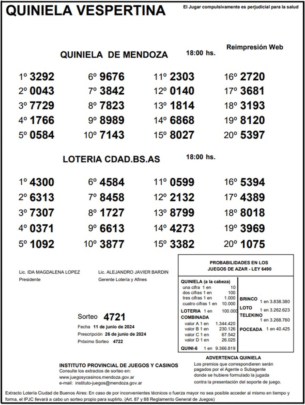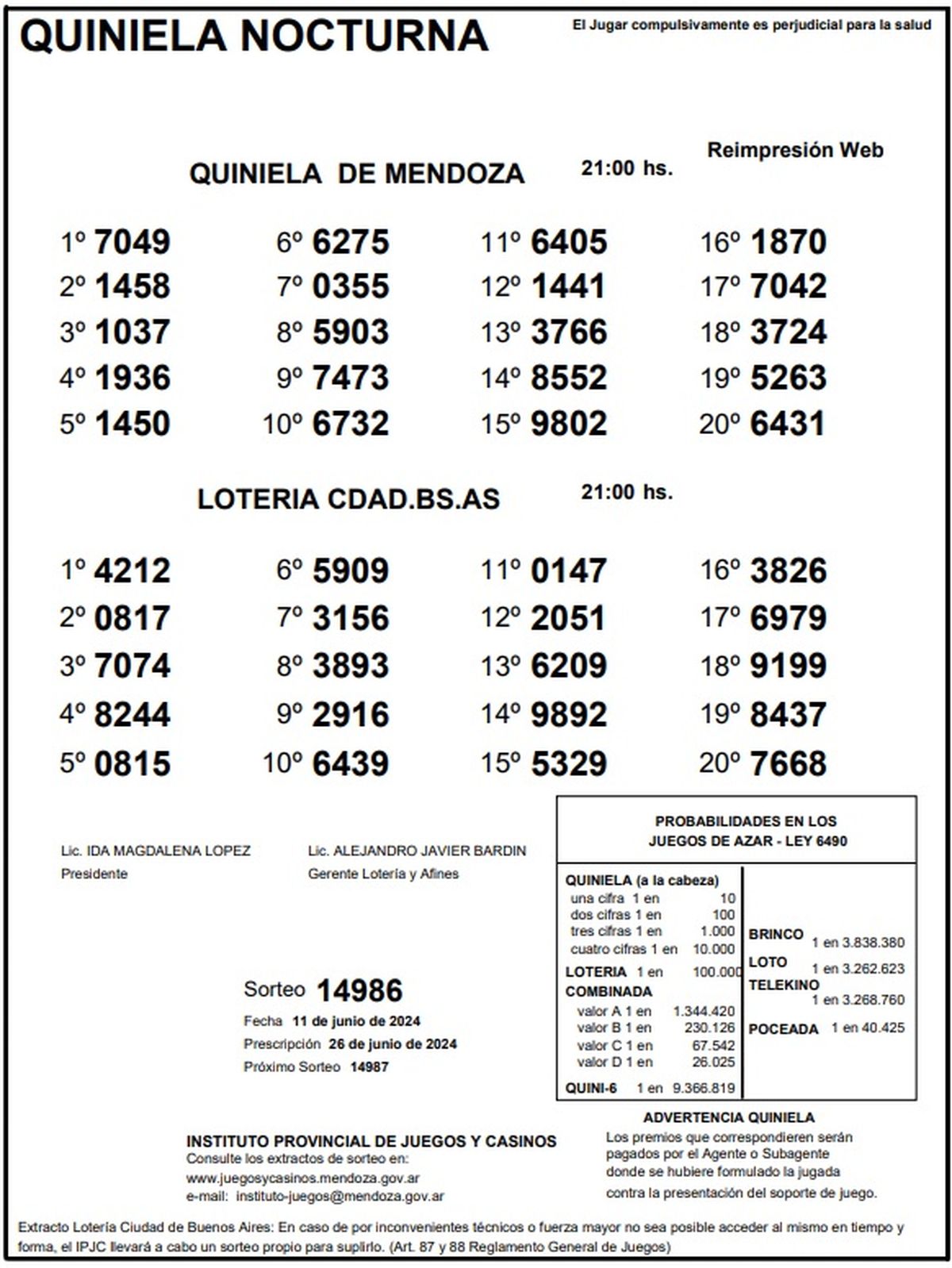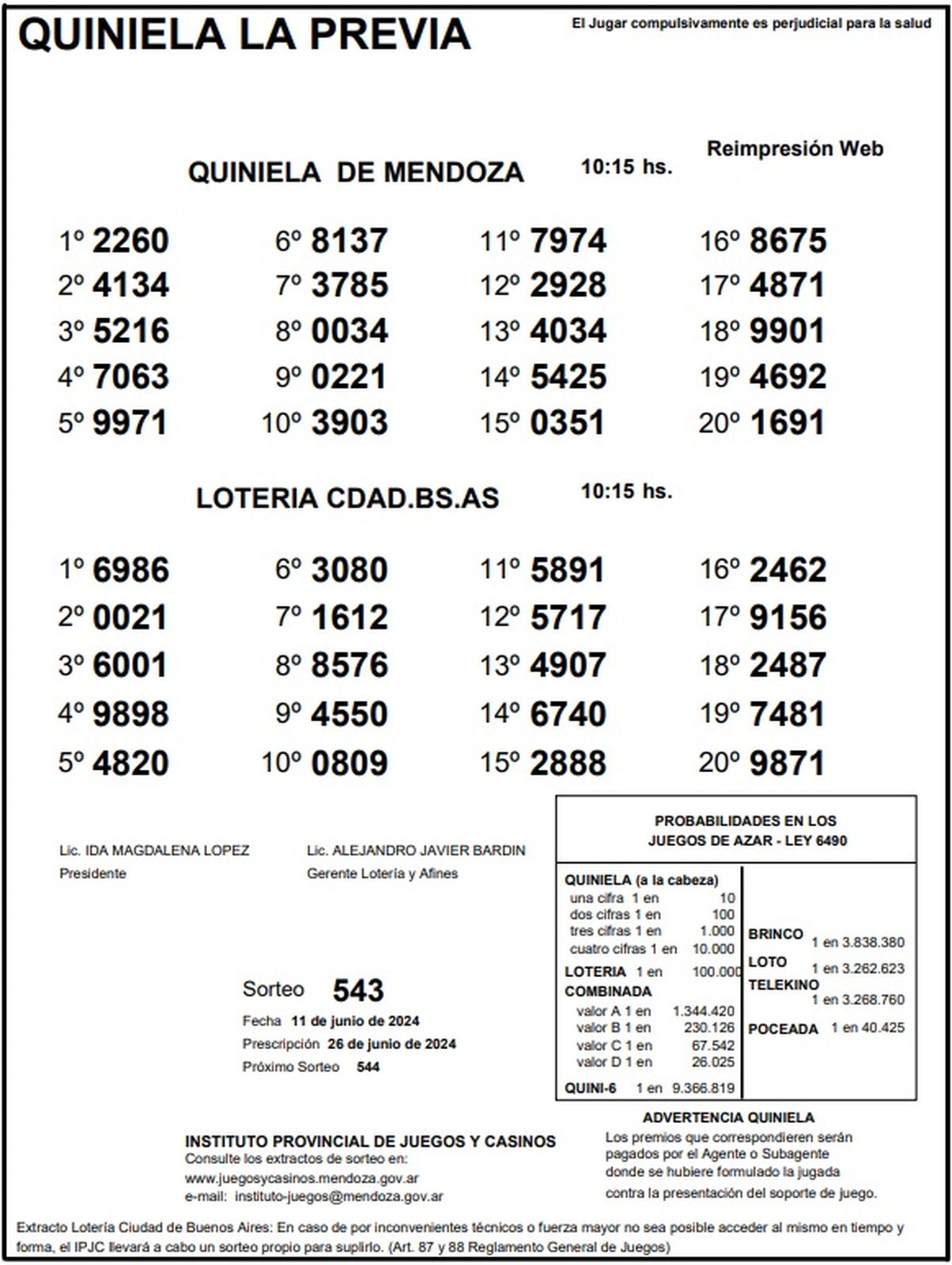 Quiniela de Mendoza: resultados de la Nocturna de hoy, 11 de junio