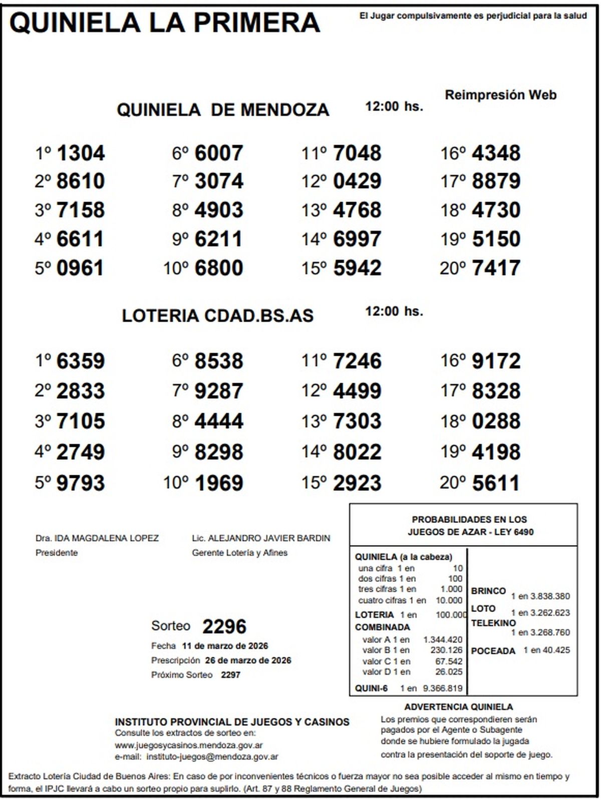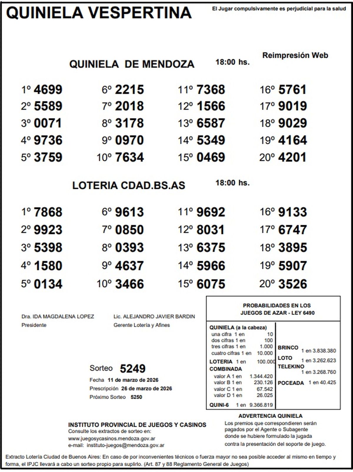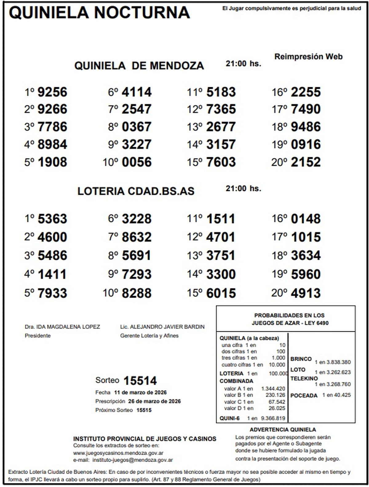 Quiniela de Mendoza: resultados de la Nocturna de hoy, 11 de marzo de 2026