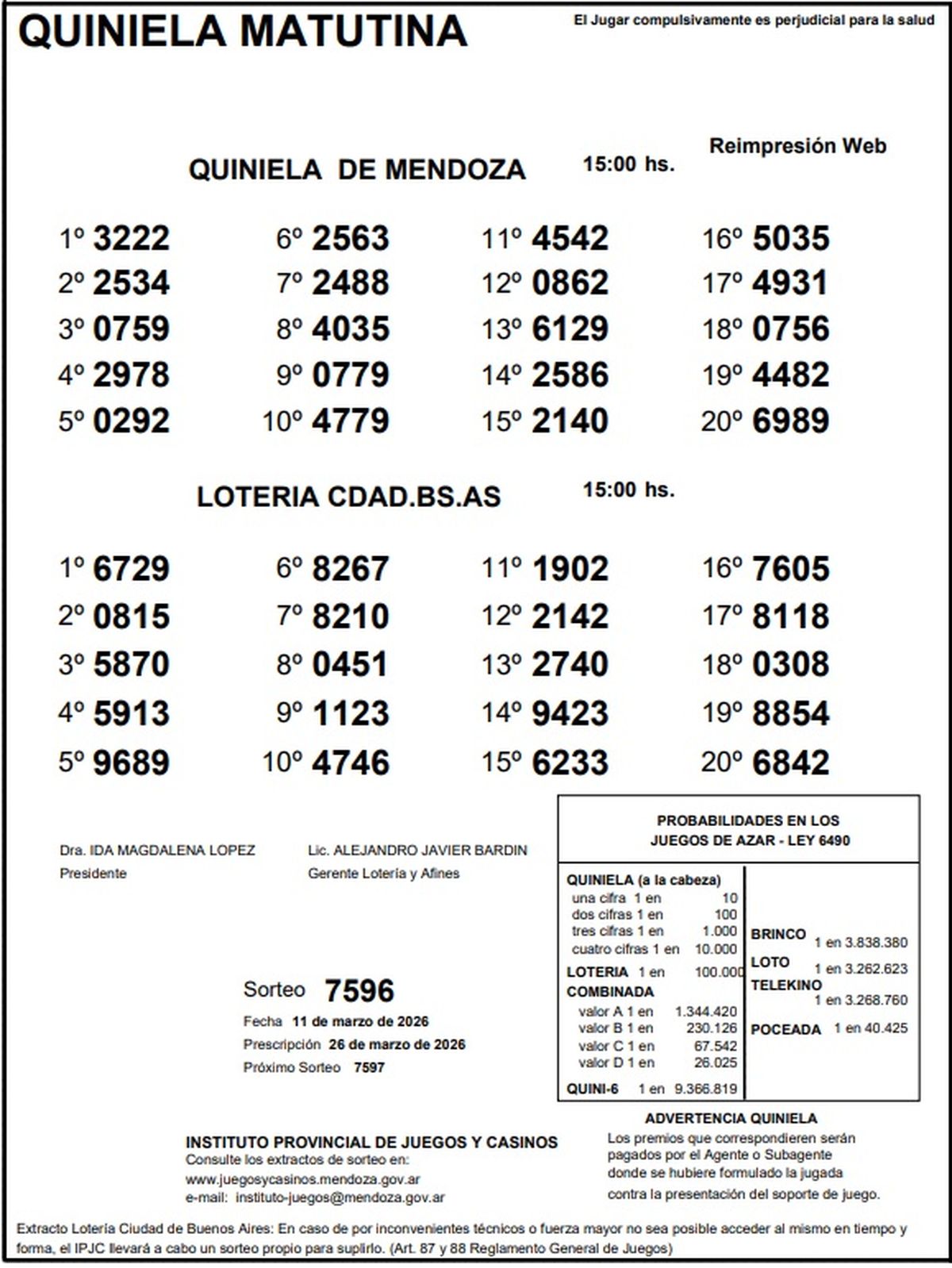 Resultados Quiniela de Mendoza: La Matutina del 11 de marzo de 2026