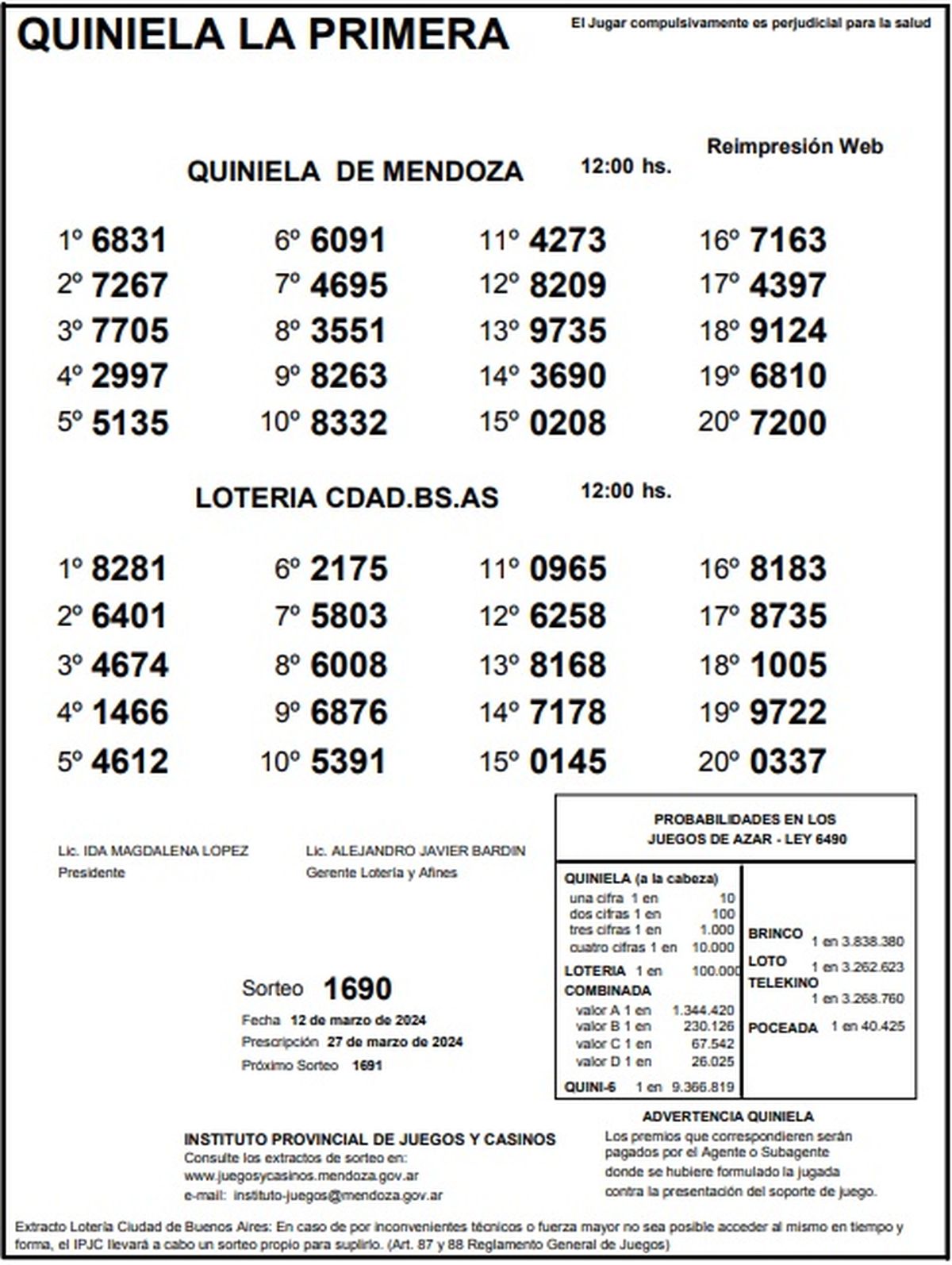 Resultados Quiniela de Mendoza: La Primera del 12 de marzo 2024