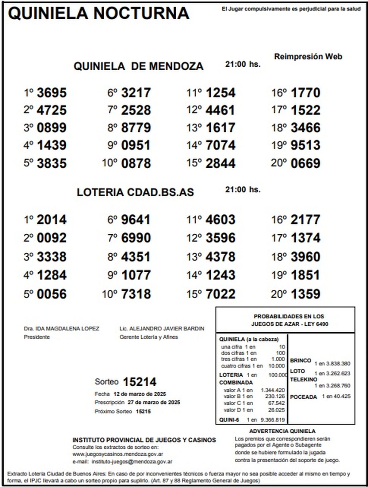 Quiniela de Mendoza: resultados de la Nocturna de hoy, 12 de marzo de 2025