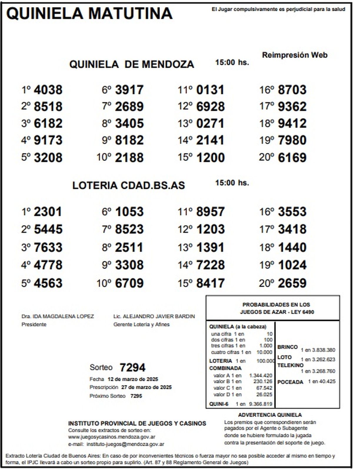 Resultados Quiniela de Mendoza: La Matutina del 12 de marzo de 2025