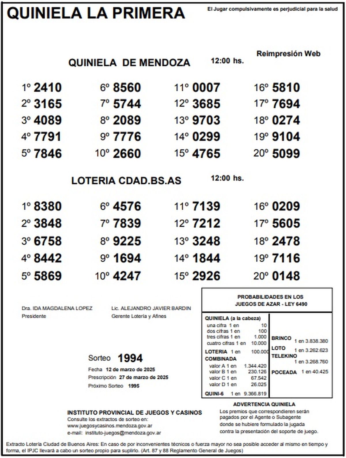 Resultados Quiniela de Mendoza: La Primera del 12 de marzo de 2025