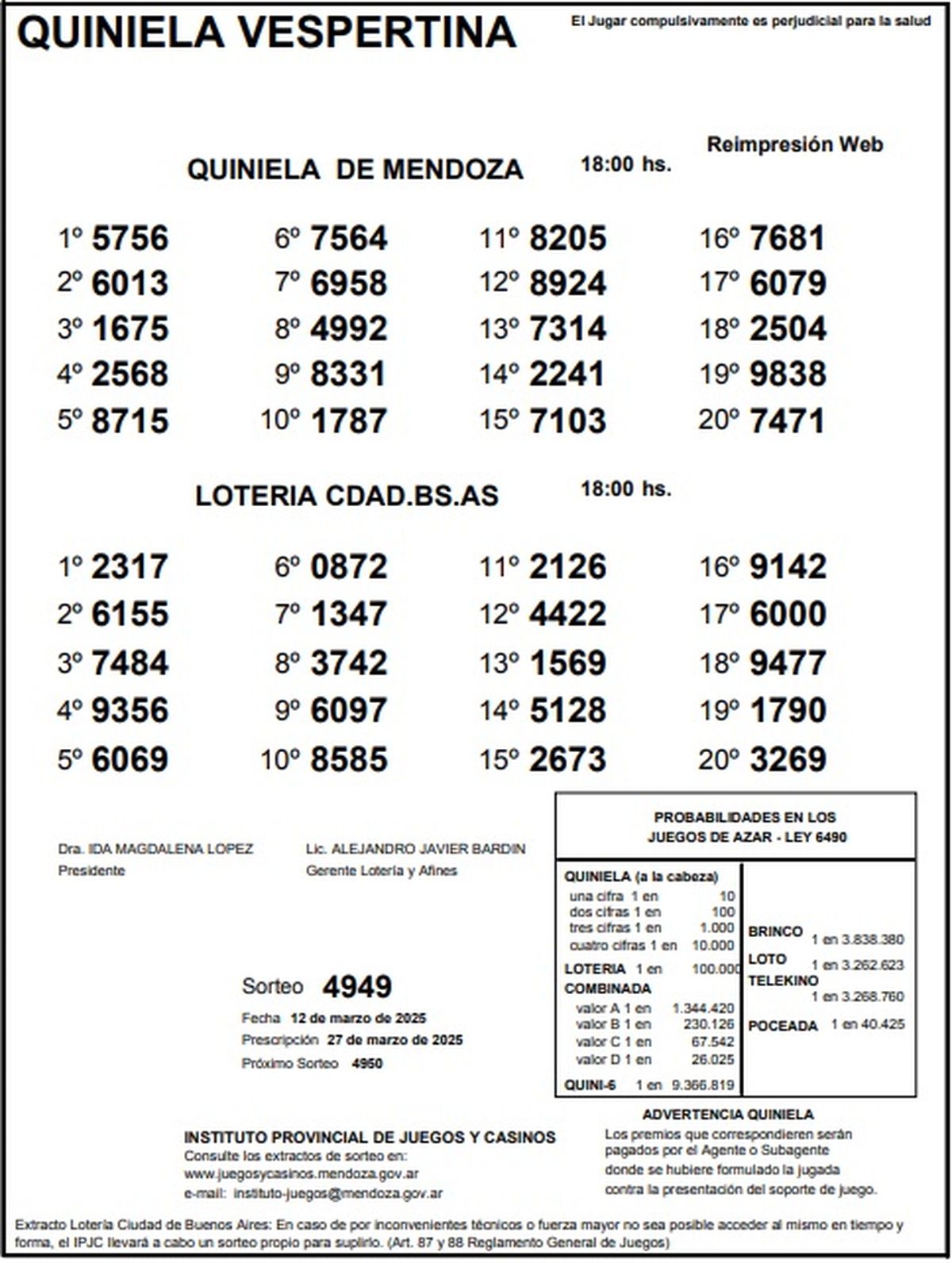Resultados Quiniela de Mendoza: La Vespertina del 12 de marzo de 2025