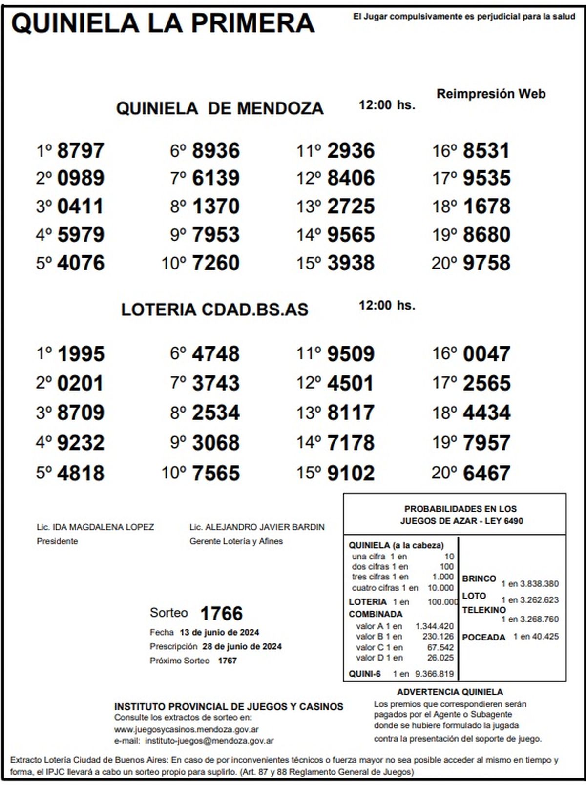 Resultados Quiniela de Mendoza: La Primera del 13 de junio 2024