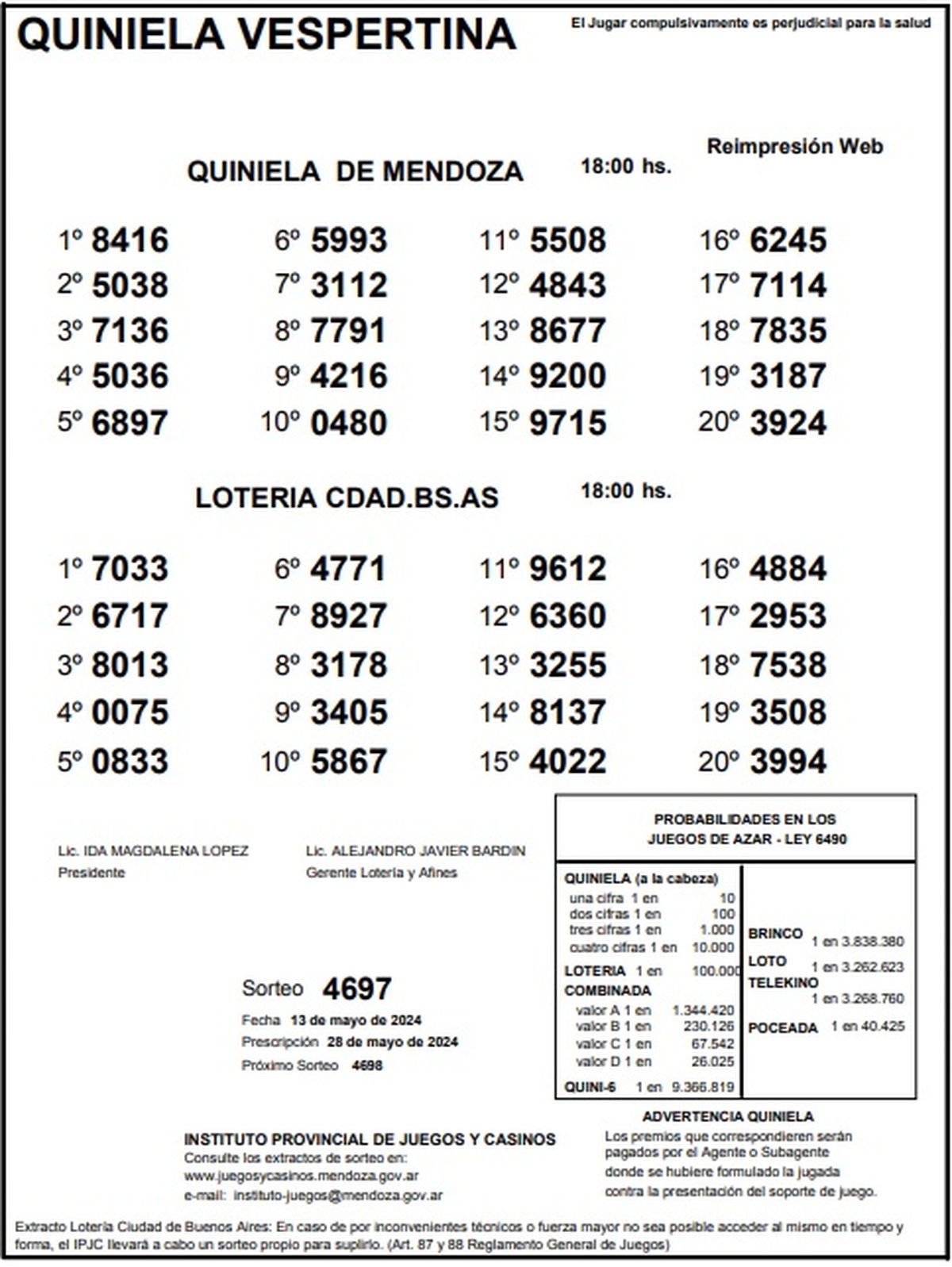 Resultados Quiniela de Mendoza: La Vespertina del 13 de mayo 2024
