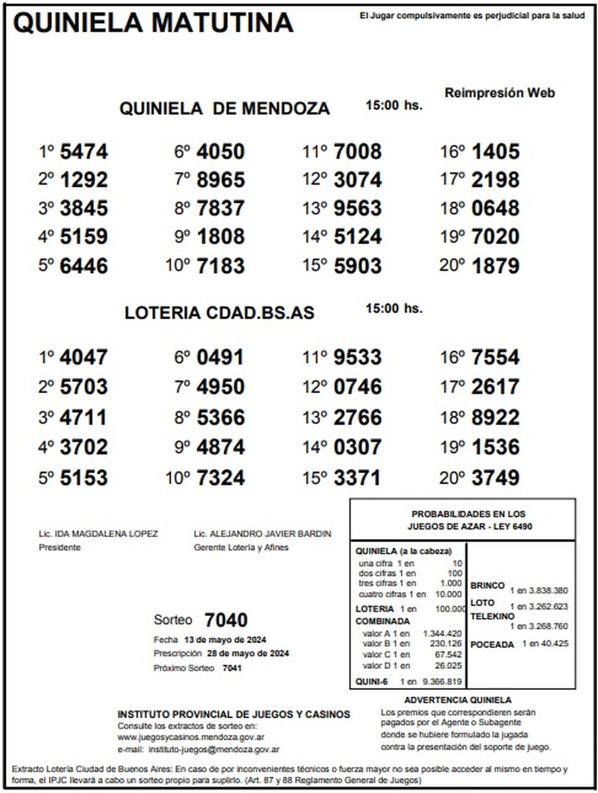Resultados Quiniela de Mendoza: La Matutina del 13 de mayo 2024
